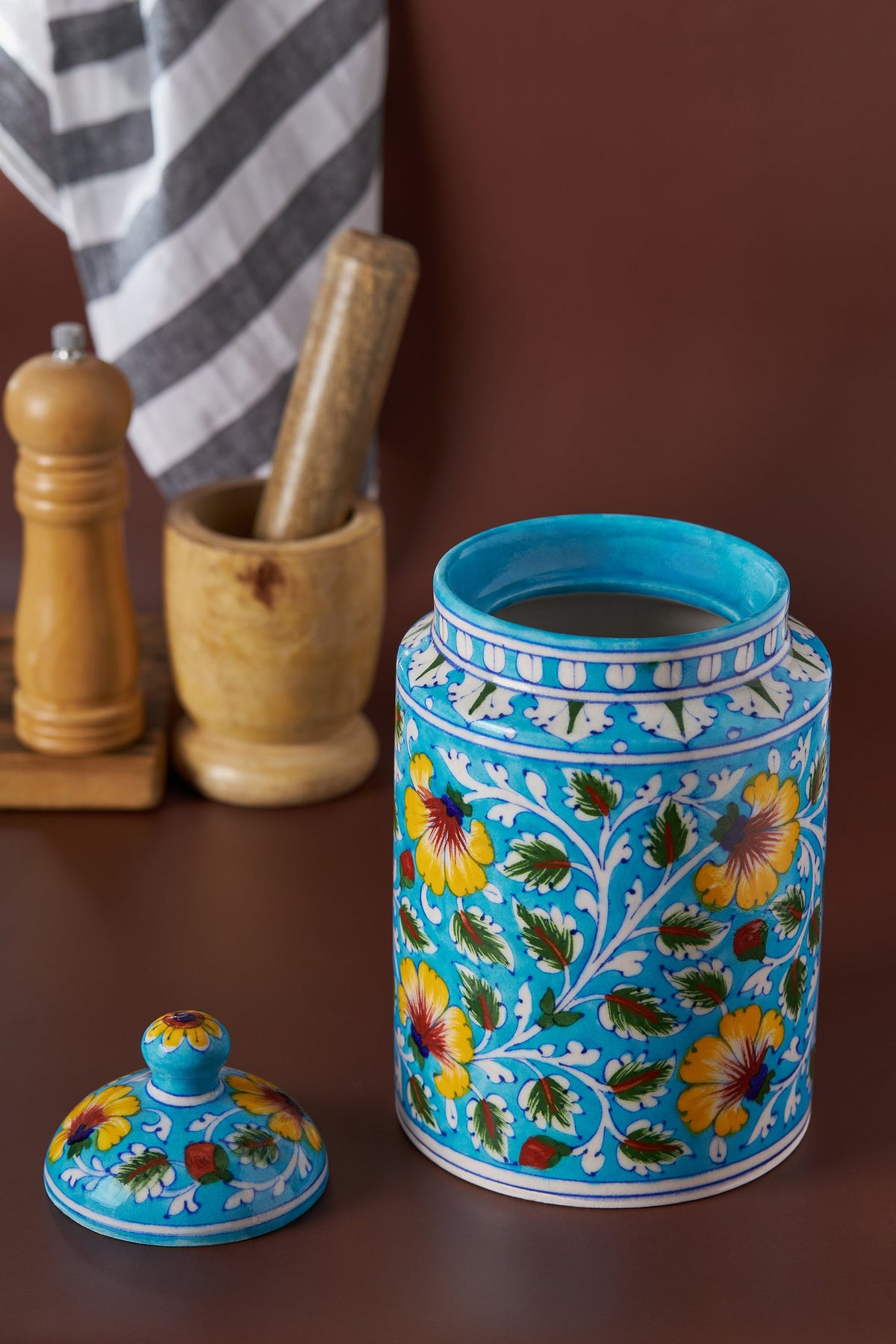 Introducing the Dhanau Decorative Kitchen Canister, a striking embodiment of Rajasthan's storied craftsmanship and vibrant culture. This elegant ceramic jar, adorned with an intricate floral motif, showcases the exquisite artistry of rural India. Each canister is meticulously hand-painted and sculpted, reflecting the dedication and skill of local artisans.