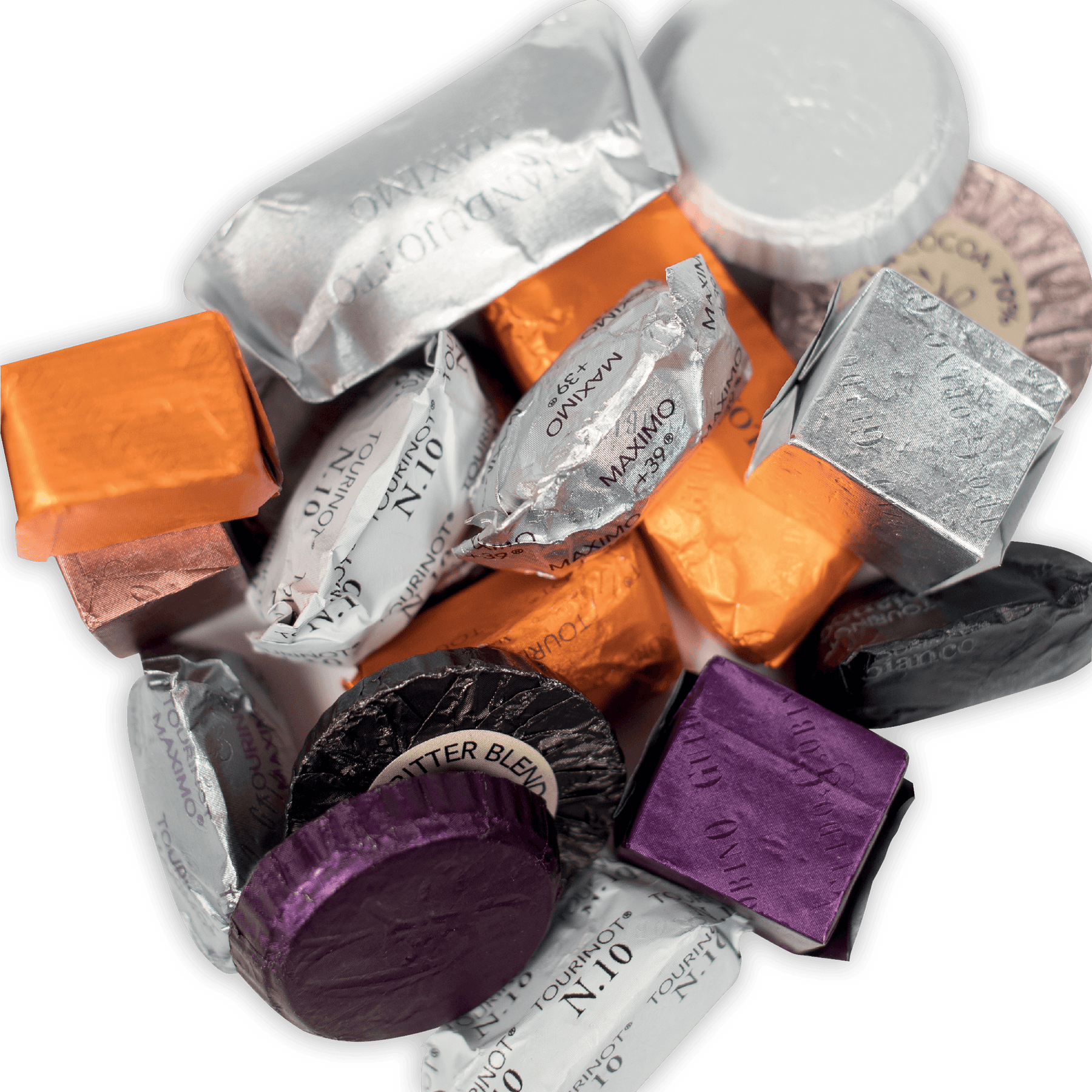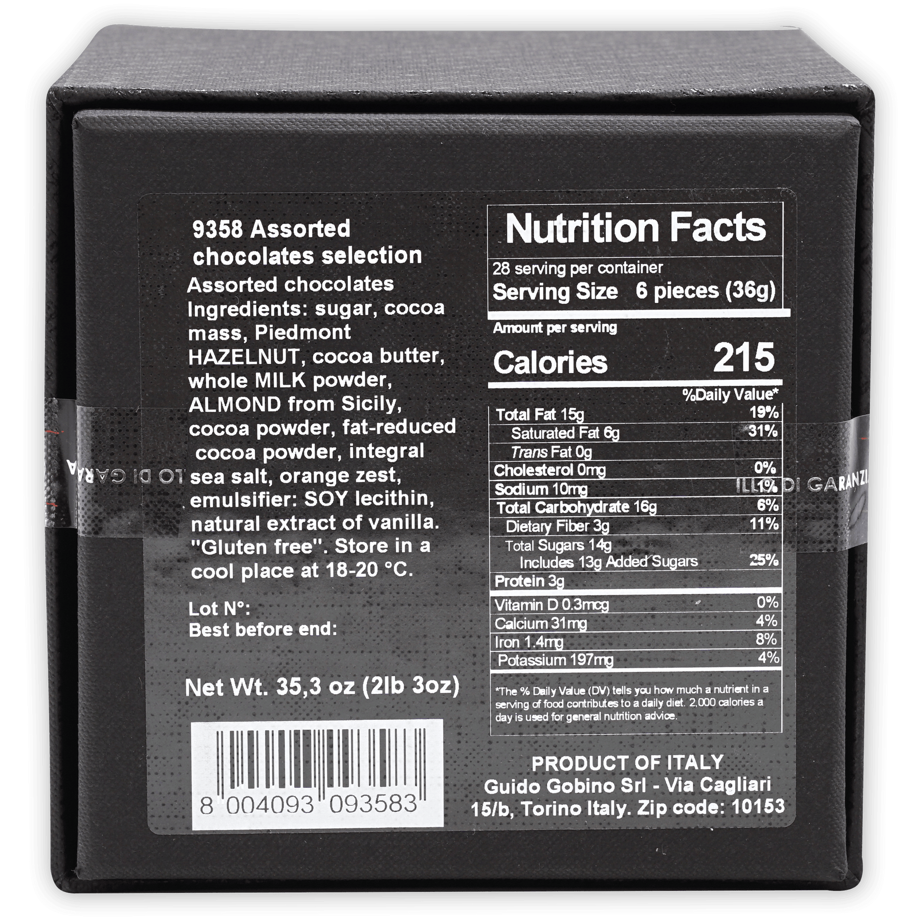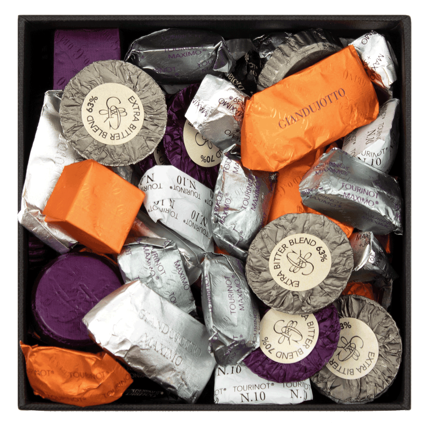 A big box (2.2 lbs) of an assorted selection from Guido Gobino Italy, this includes approximately 140 pieces of the classic and maximo giandujotti, as well as cremini and dark chocolate disks pieces. Each box of artisanal chocolates are entirely made by hand at Guido Gobino's factory in Turin: every piece, bag, box are entirely composed by hand, by placing love with each chocolate assortment.