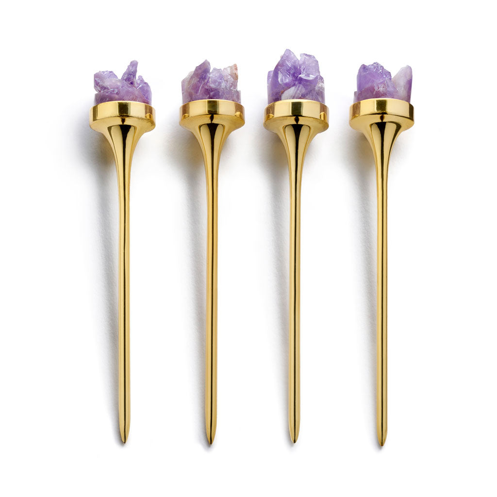 Hospitality Cocktail Picks, Gold & Amethyst Druze, Set of 4 by ANNA New York