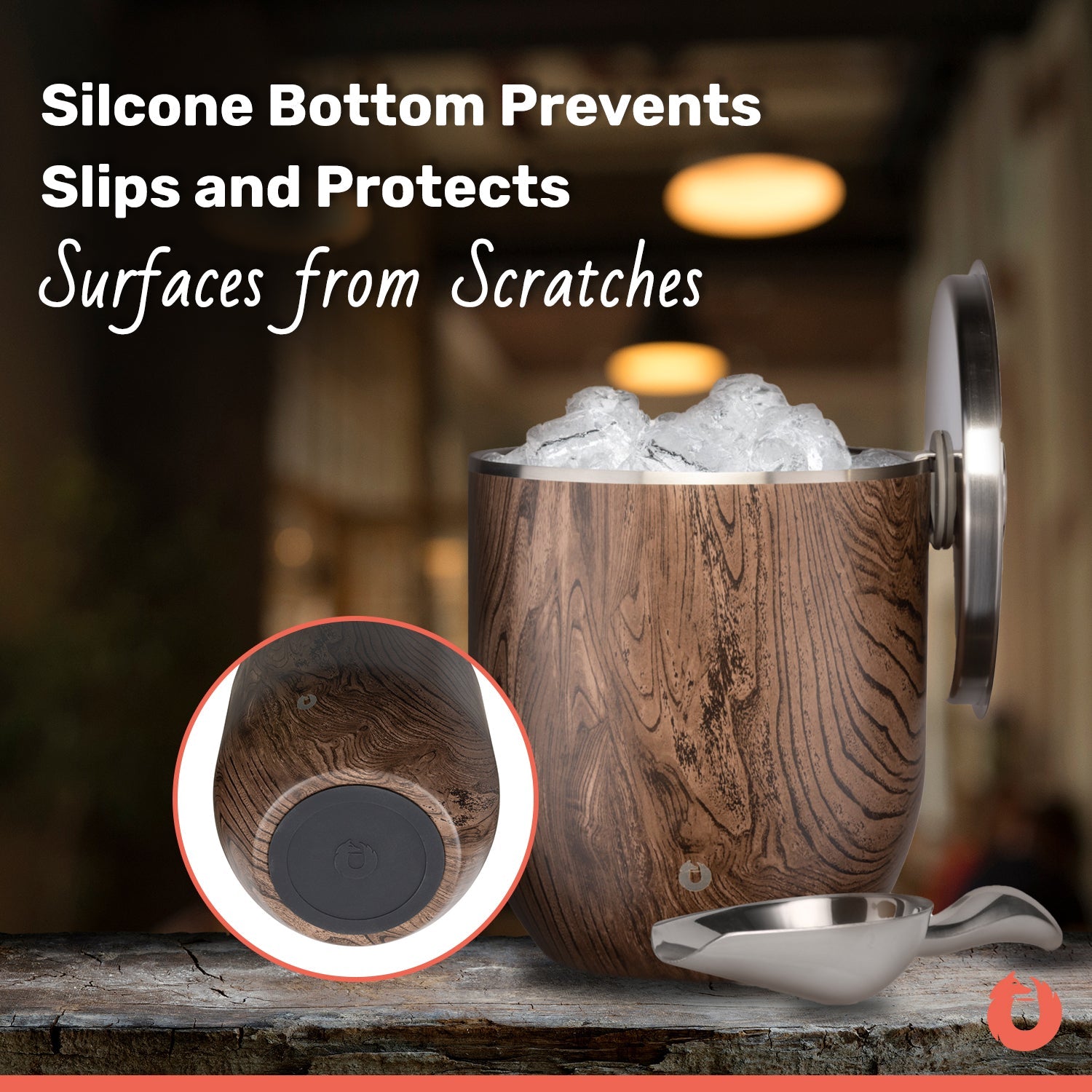 Stainless Steel Ice Bucket with Lid and Scoop, Dark Walnut by Snowfox
