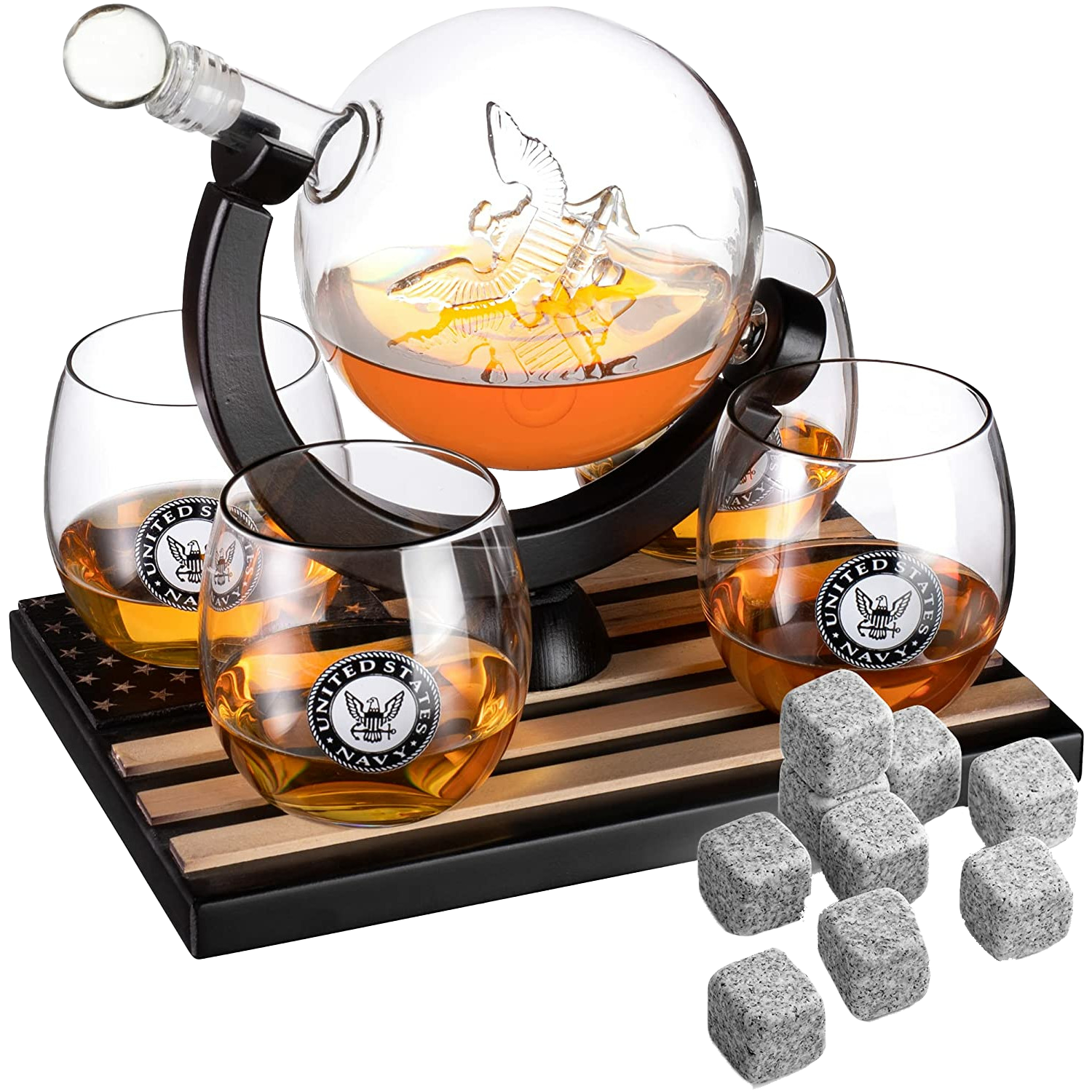 • GORGEOUS HANDCRAFTED ACCENTS - The globe whiskey decanters are handblown from 100% lead-free borosilicate glass with a finely crafted and precision etched United States Navy Symbol on the inside. Mahogany wood base offers a refined yet masculine approach.