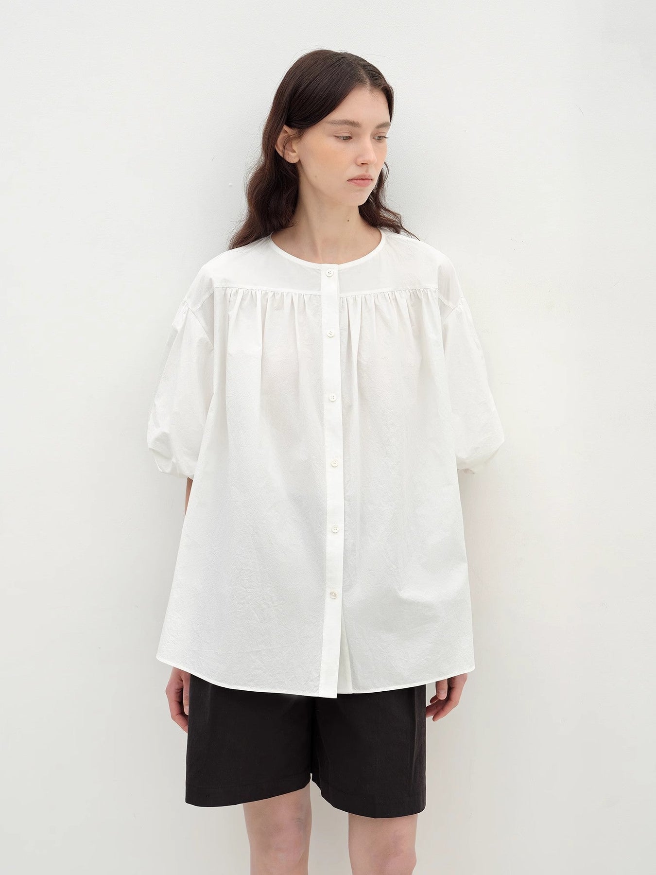Selected Pima cotton and Brazilian cotton blend, the washing and dyeing process creates a slightly wrinkled texture, soft and dry, exquisite small round collar shape is elegant and simple, full puff sleeves add a sense of shape, sweet and elegant loose straight version is loose and comfortable, the pleated shape of the body adds visual layers, smart and stylish.