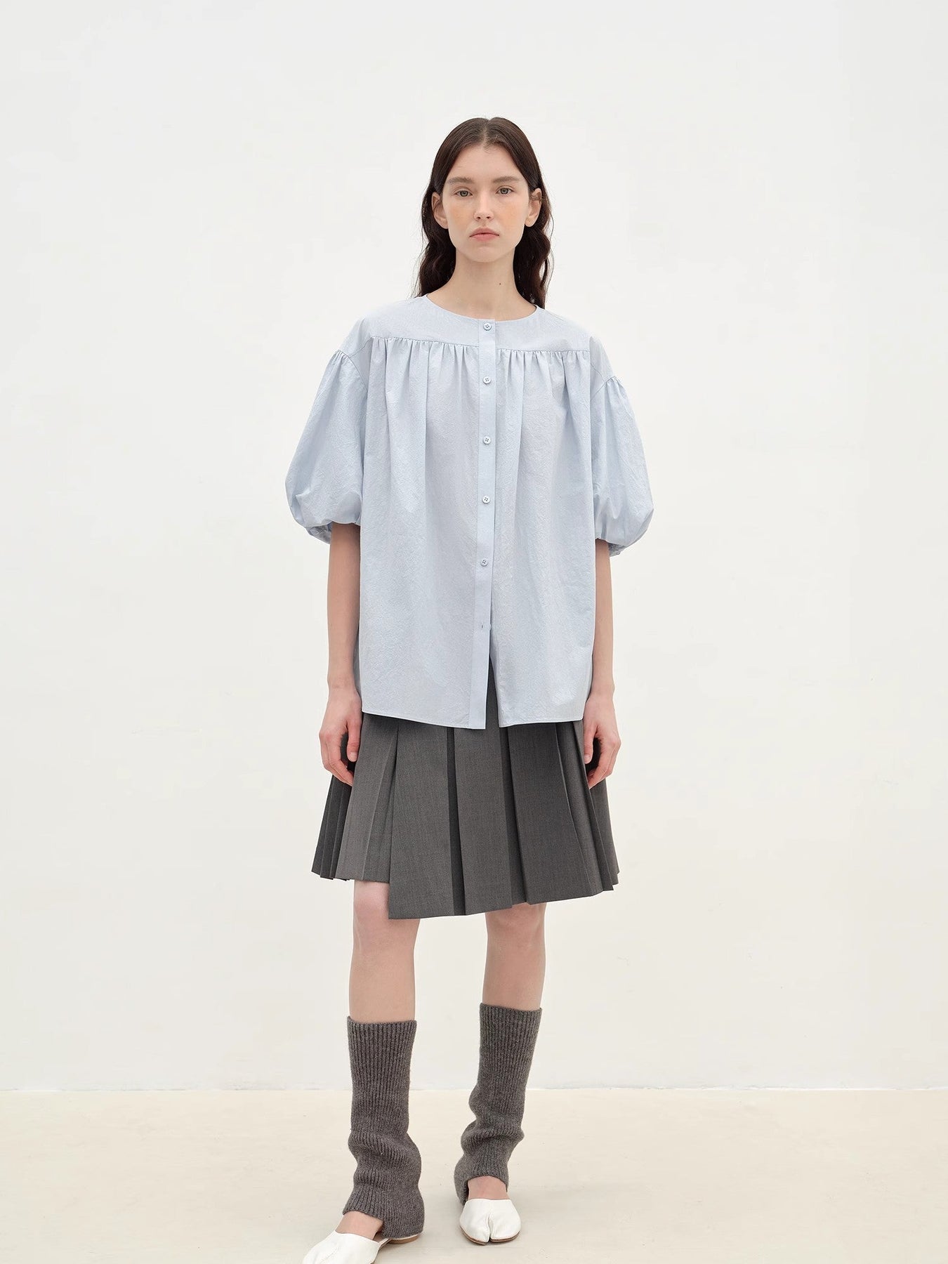 Slightly wrinkled cotton puff sleeves with pleated short top