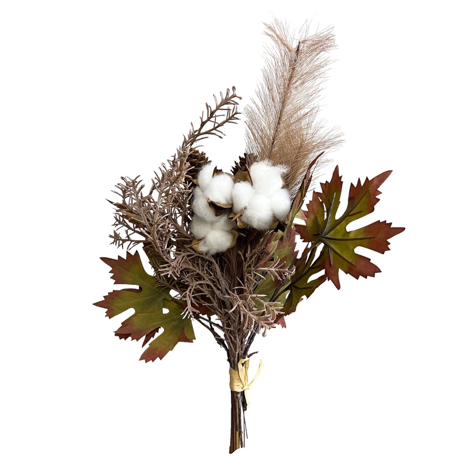 • Natural cotton blooms, artificial maple leaves, pinecones, and wispy grass combine to create a stunning autumn-inspired bouquet.