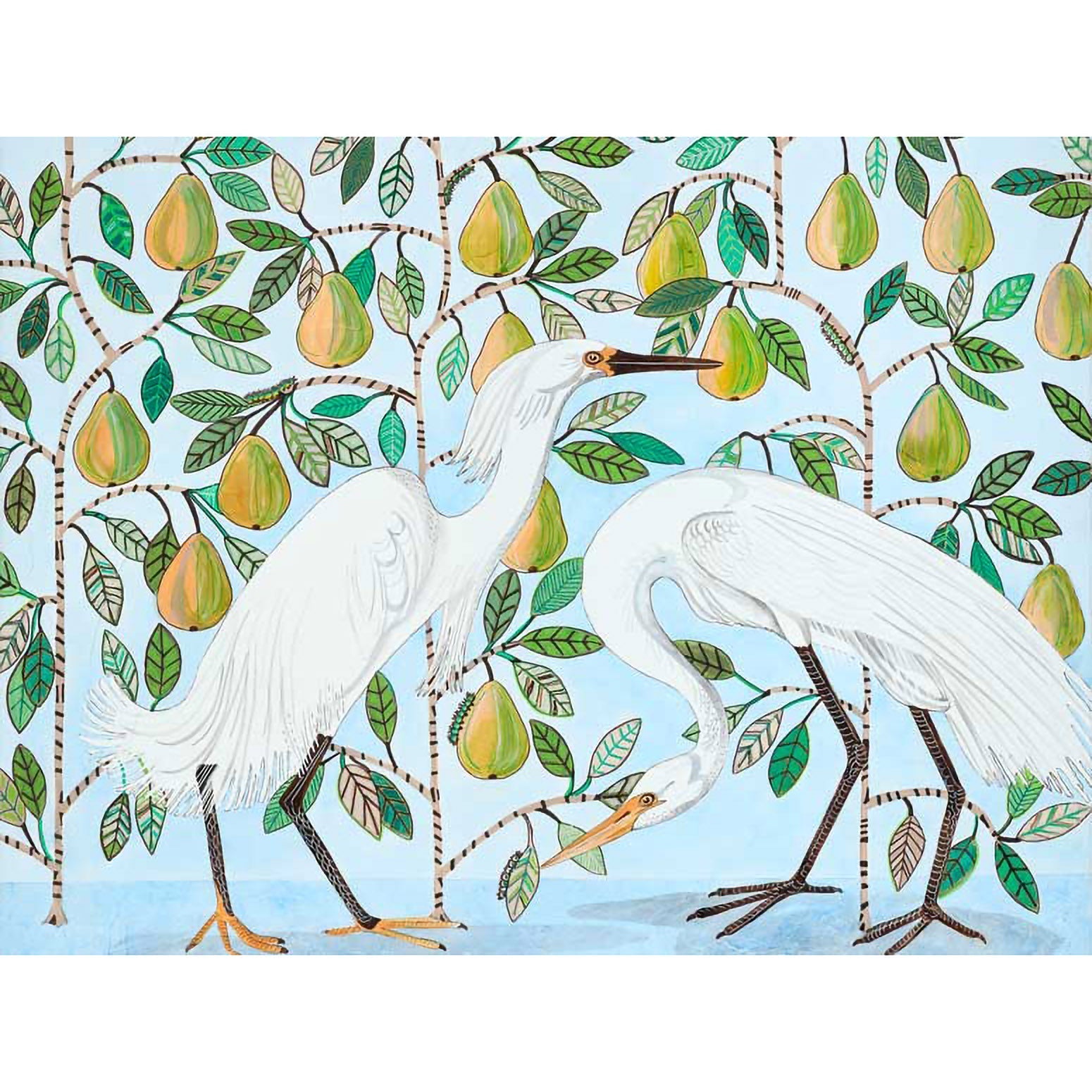 In a background of peaches, Pat Scheurich paints a pair of egrets scavenging for lunch.