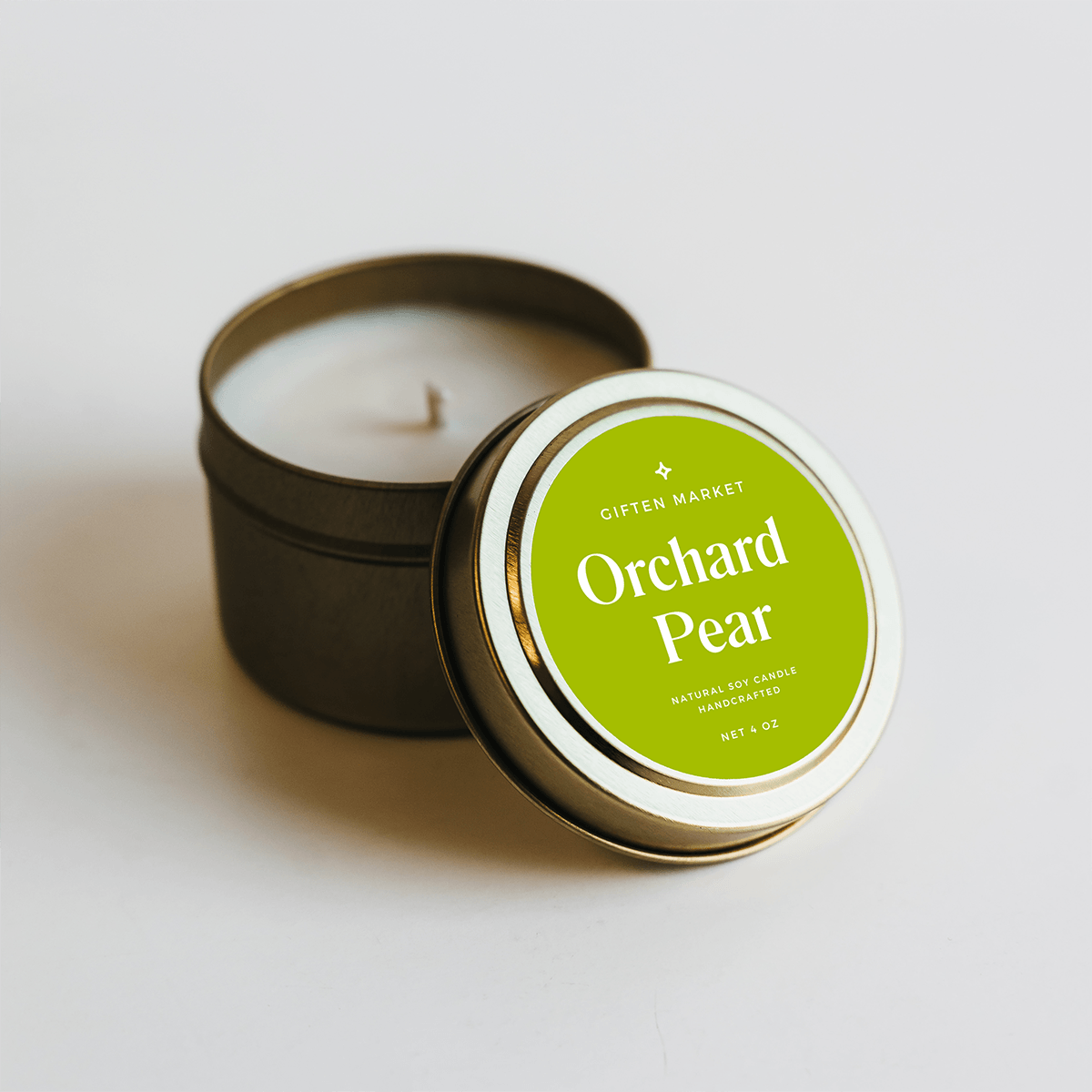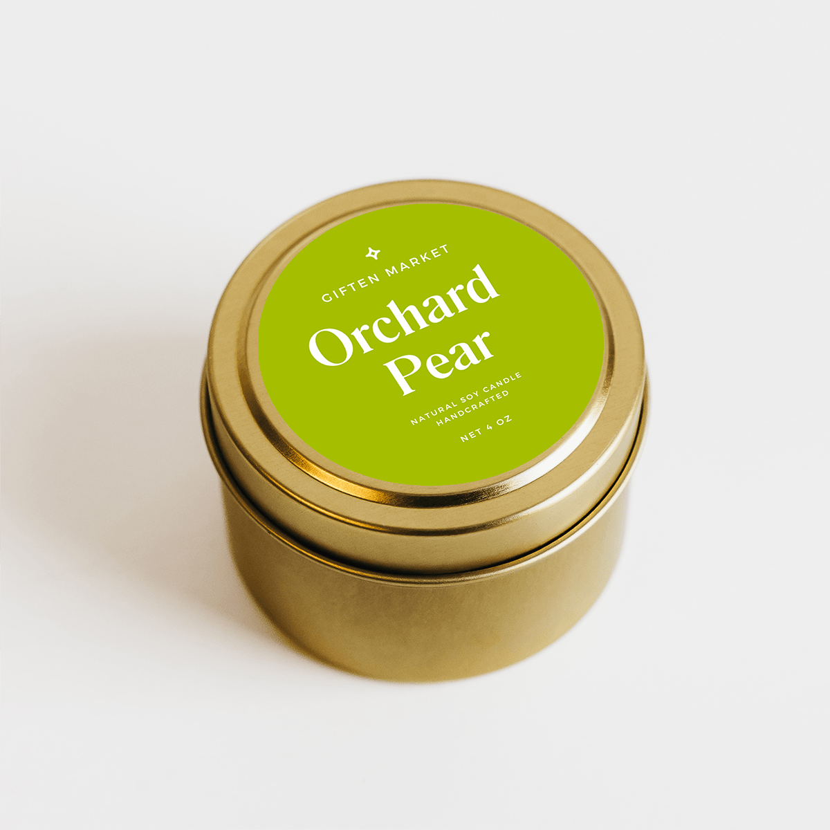 Introducing the Orchard Pear Gold Travel Candle, a delicately crisp and juicy addition to our collection of fruit-centric scents.
