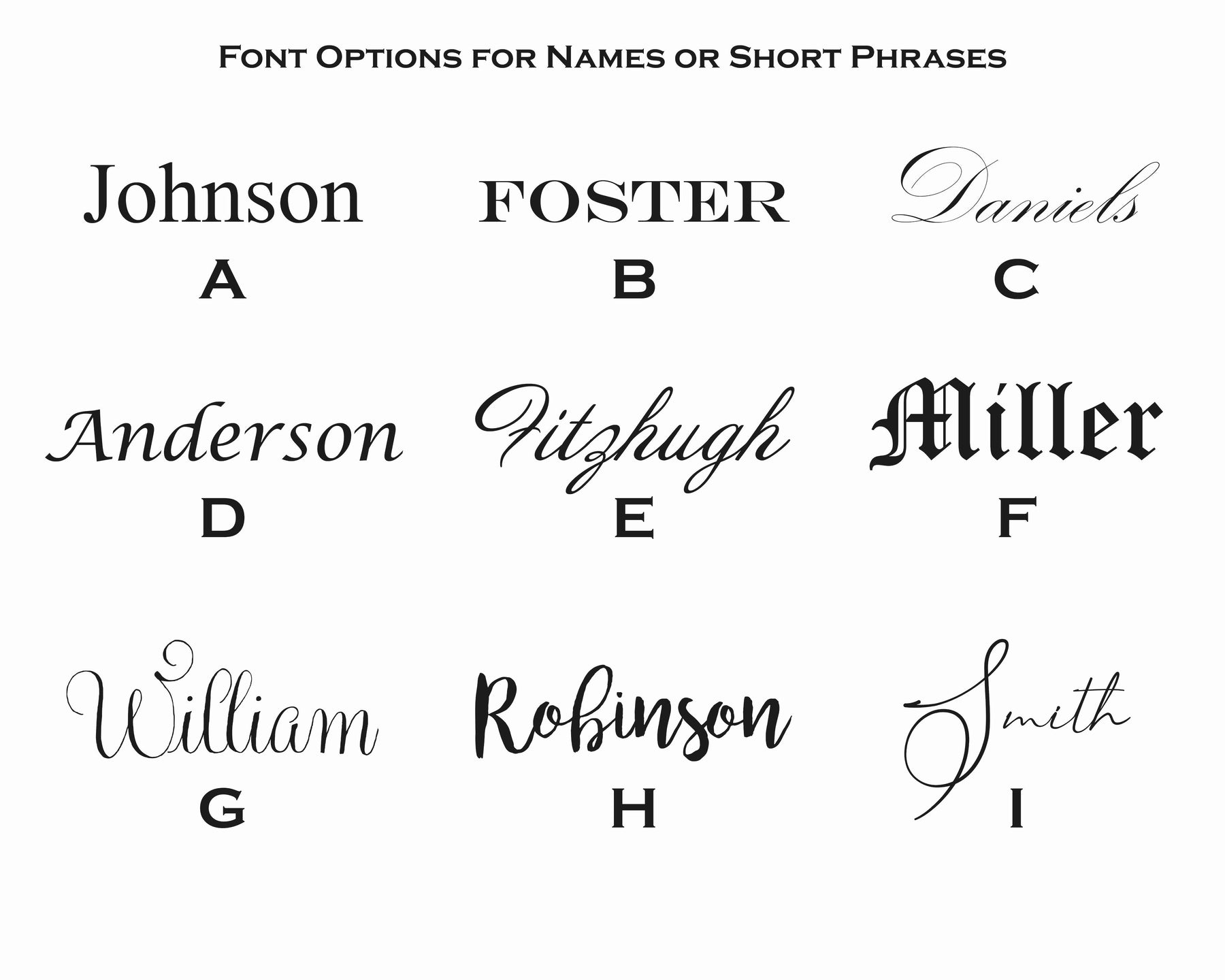 1. If you would like engraving, please take note of your selections and add them to the personalization box when checking out. You can find the box to enter the information by clicking on your cart in the upper right hand corner of your screen. If your selection requires other personalization information, like an initial, name, or date, please leave that in the box as well. If you would like a Mom, Dad or Wedding options, please indicate the number from our design options. If you would like a name or short phrase engraved, please indicate what font you want with letters (A-F). Monogram styles can be indicated with a double letter selection (AA, BB, CC, etc,). Be sure to indicate which engraving location! The more details you can provide, the better!