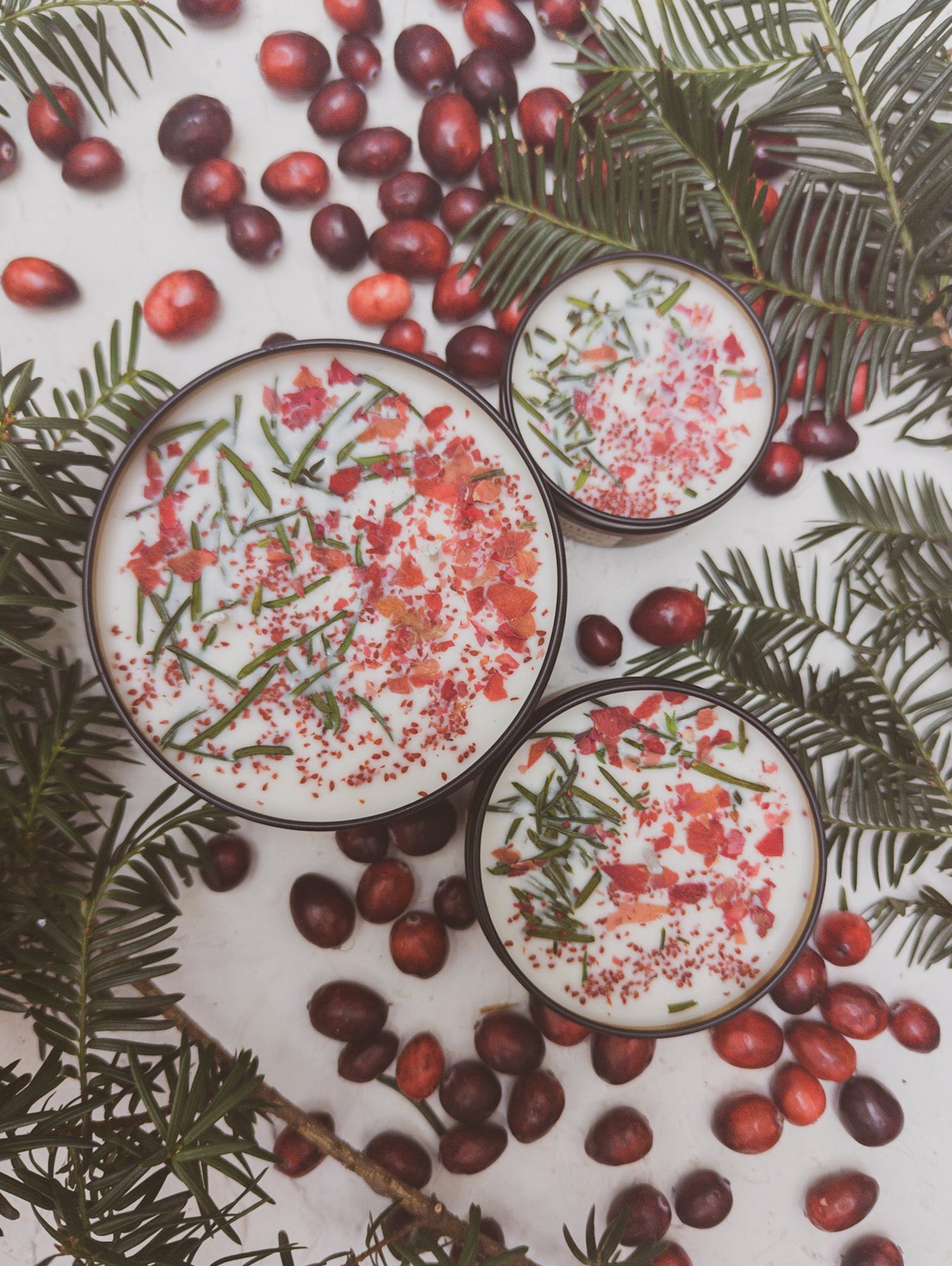 This handmade soy candle is packed with festive color and aroma. The beautiful matte black tin is lined in shiny gold, filled with USA made 100% soy wax, and topped with cranberry seeds, evergreen yew leaves, and crushed red rose petals.