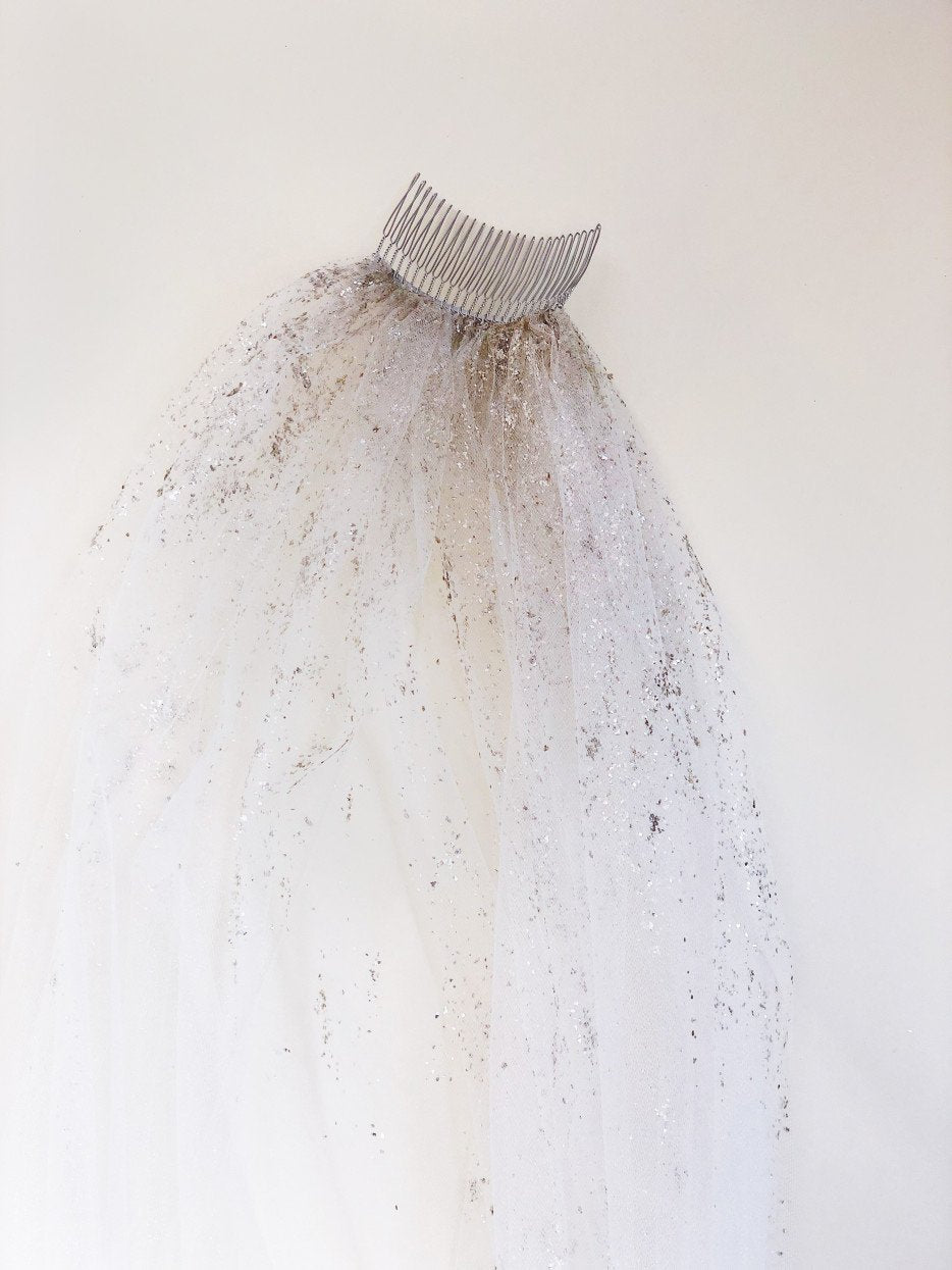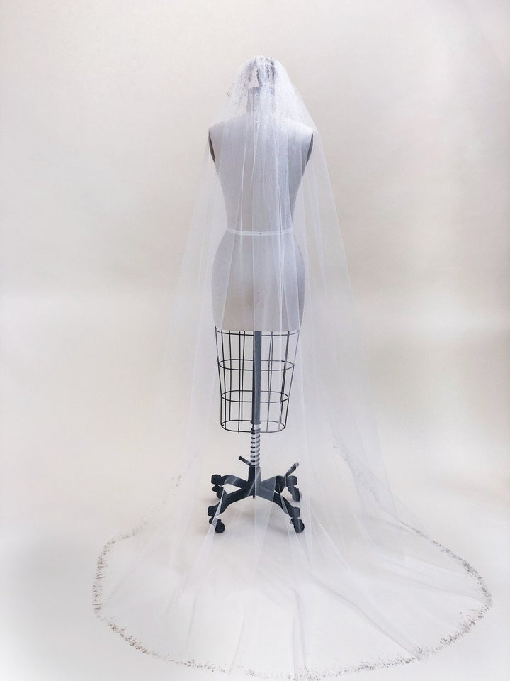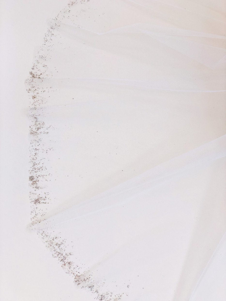 This is a stunningly beautiful sparkly veil.  The pearl dust is absolute magic and looks both gold and silver in different lights! Dust is scattered at the comb and around the edge.