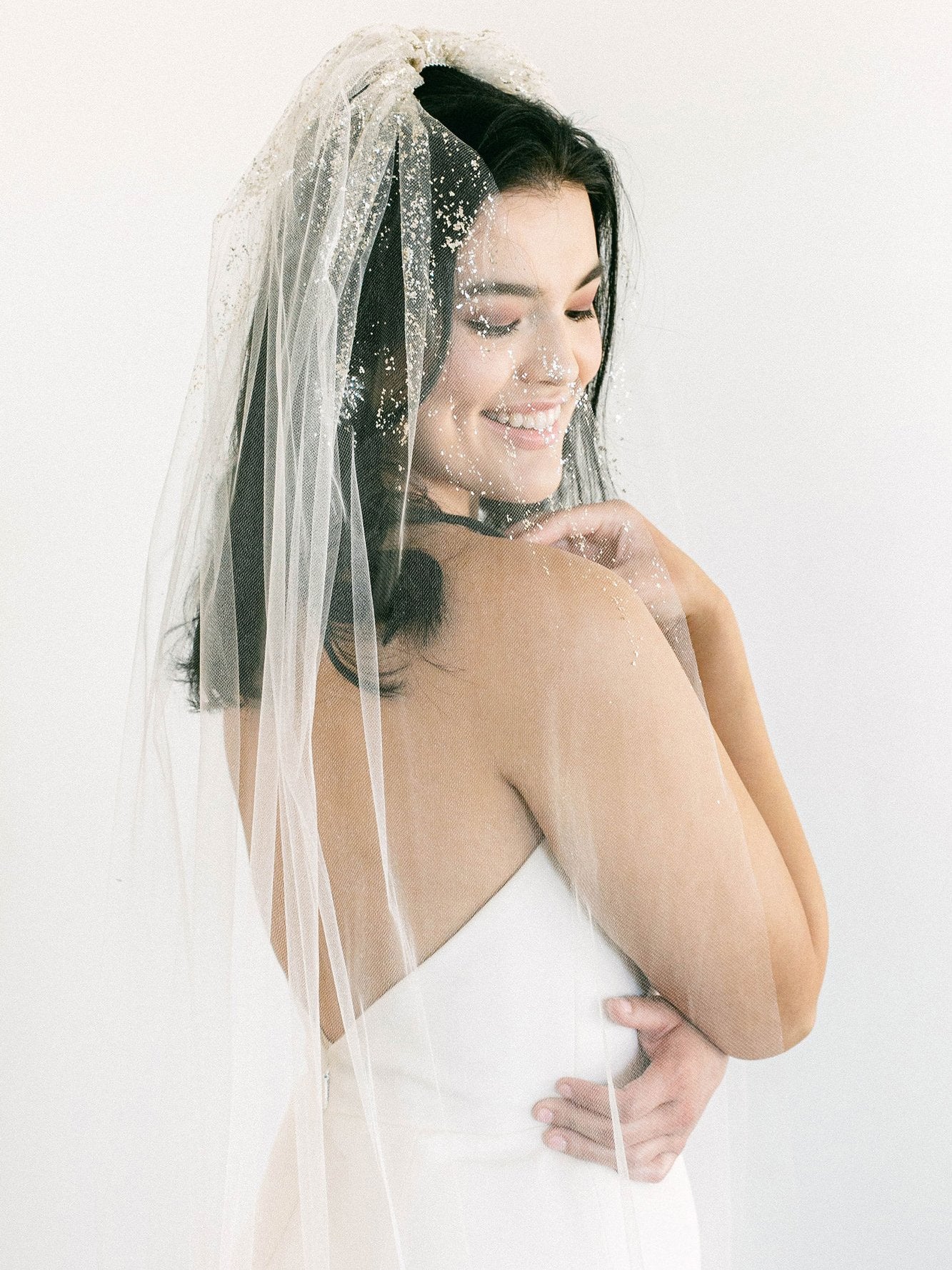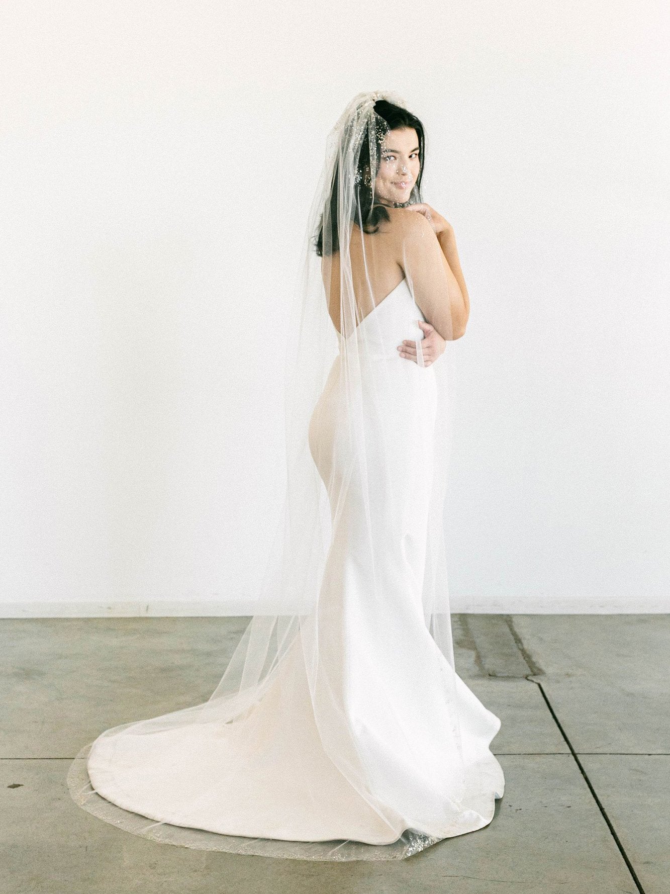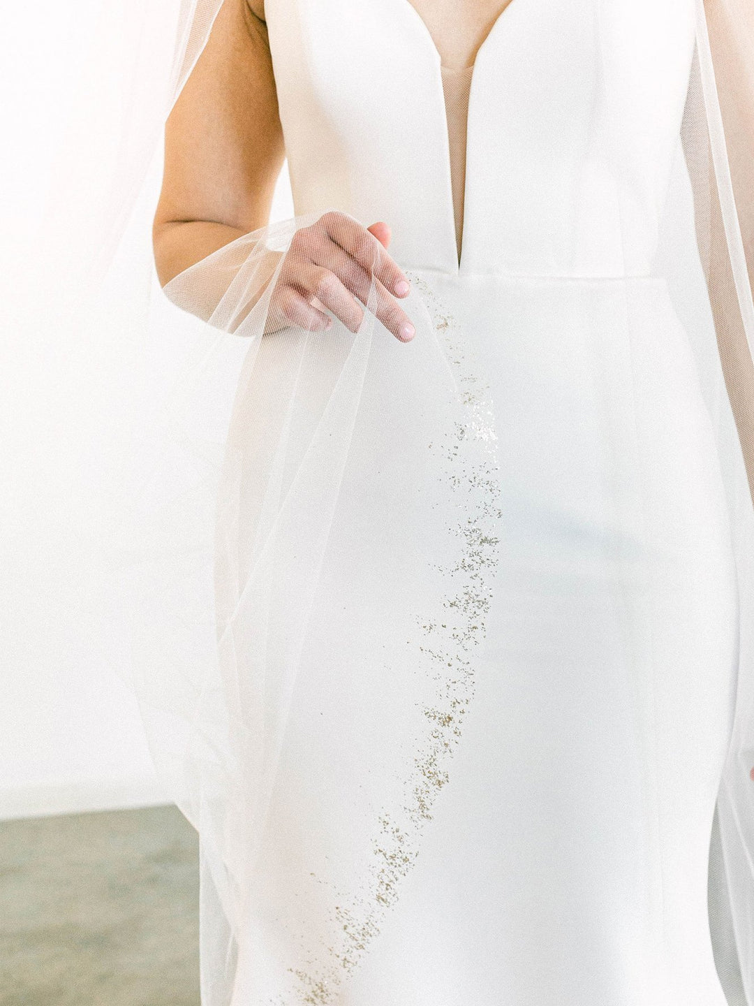 This is a stunningly beautiful sparkly veil.  The pearl dust is absolute magic and looks both gold and silver in different lights! Dust is scattered at the comb and around the edge.
