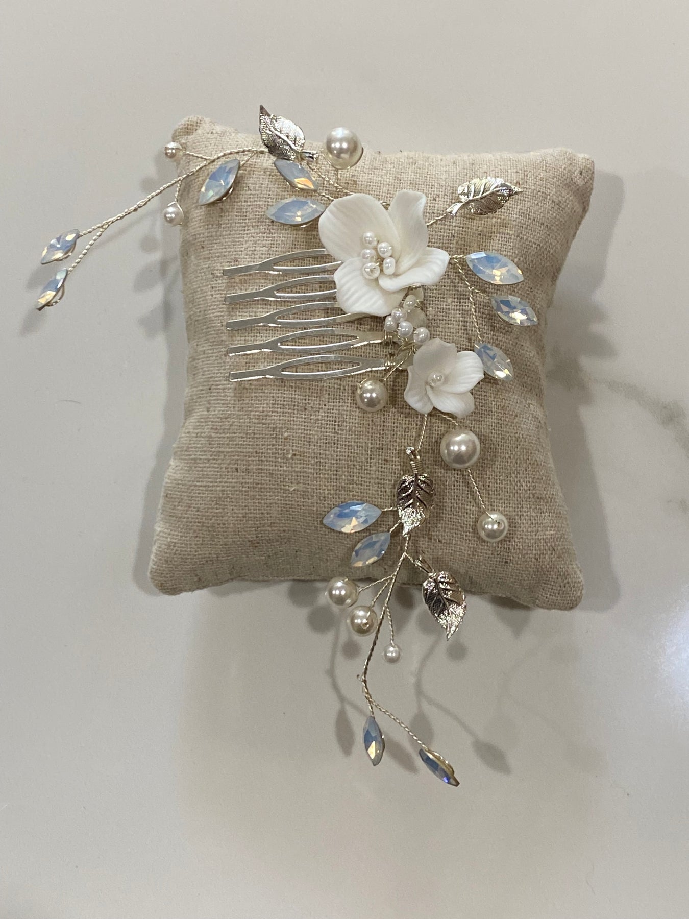 White ceramic flowers with silver leaves and vines sit atop this silver comb for a fresh spring or summer bridal look.