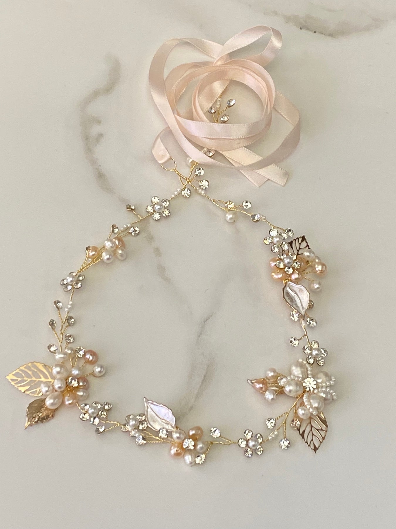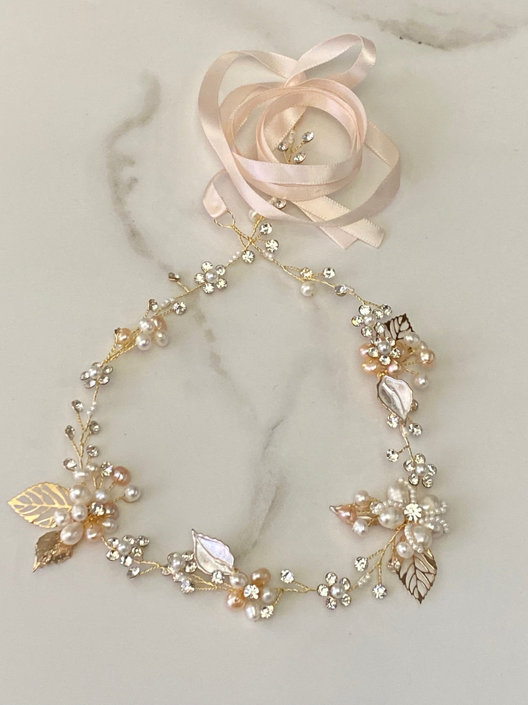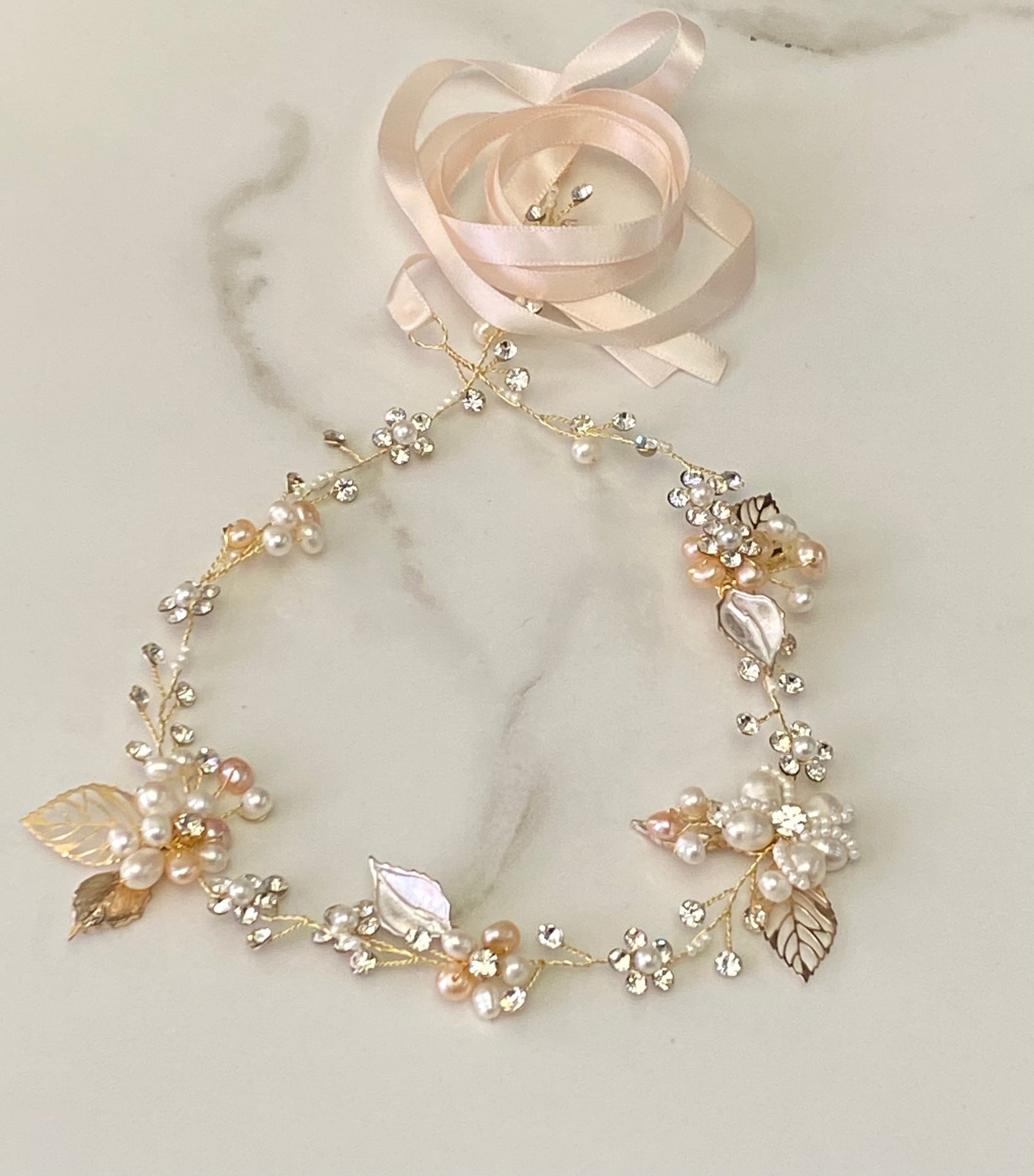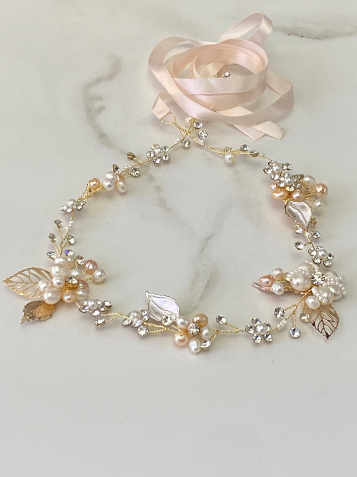 Maiman is a feminine and romantic headpiece in blush tones.  The metallic leaves are complemented by blush and ivory pearls and some dainty crystals are scattered throughout.  It's finished with blush ribbon ties.
