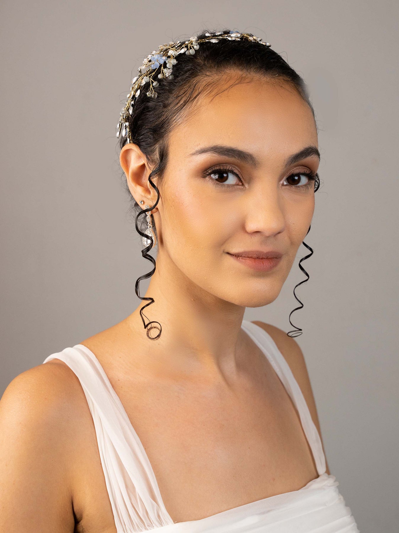 This headband exudes ethereal and whimsy vibes.  The dainty silver leaf accents and soft blue hued crystals sit on a thin black band.  The detail is featured on one side of the band and the other side is plain.