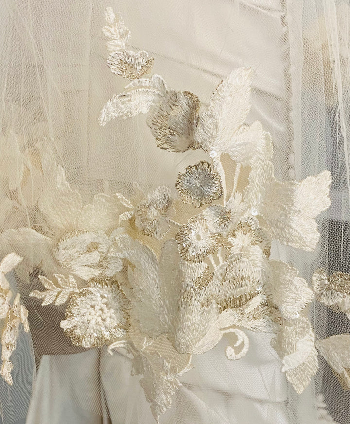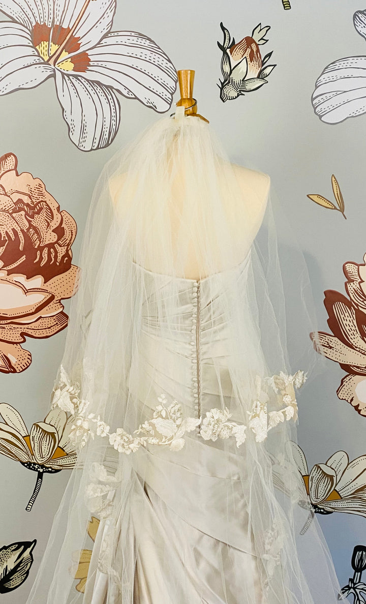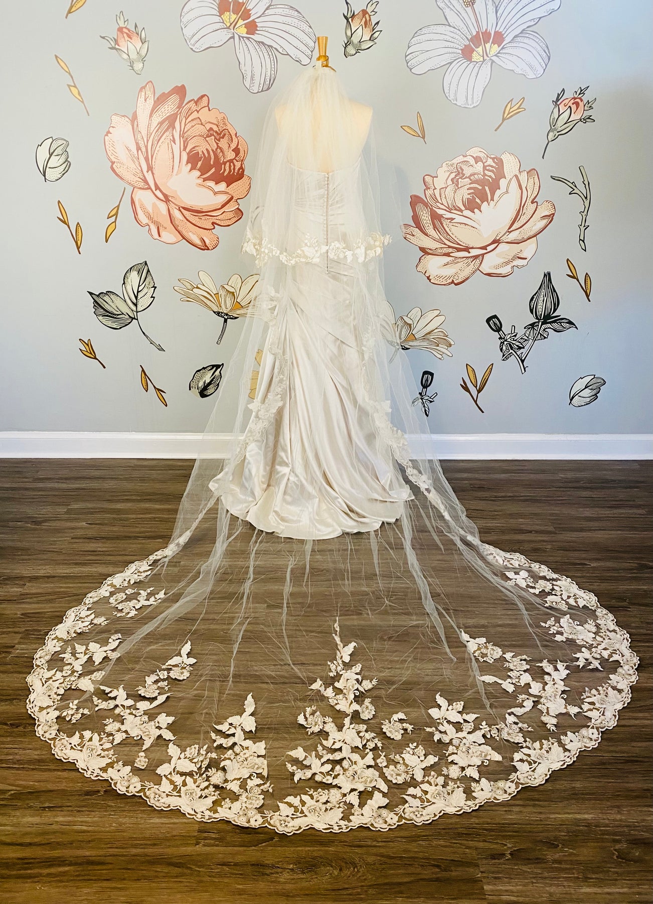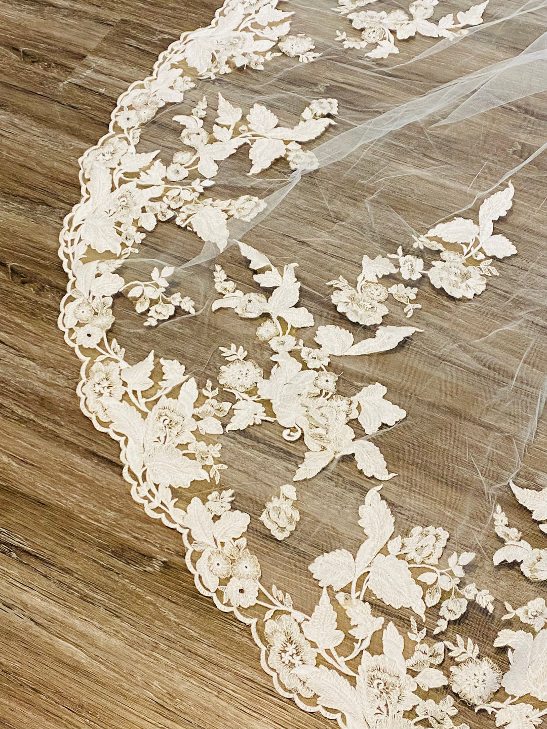 The Lilli veil is a stunning two layer cathedral veil edged in a champagne hued floral lace embroidery.
