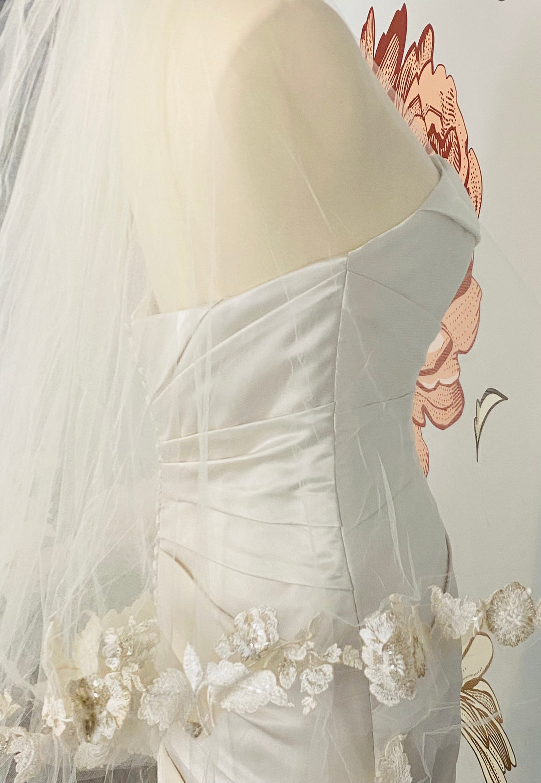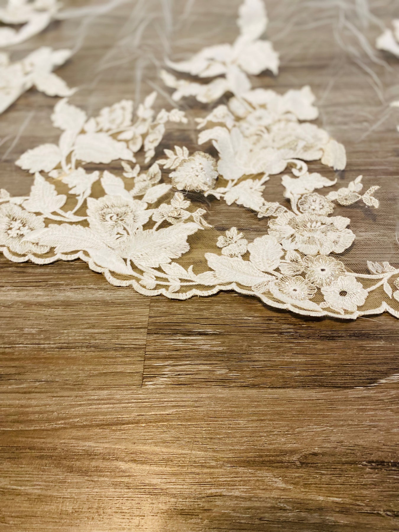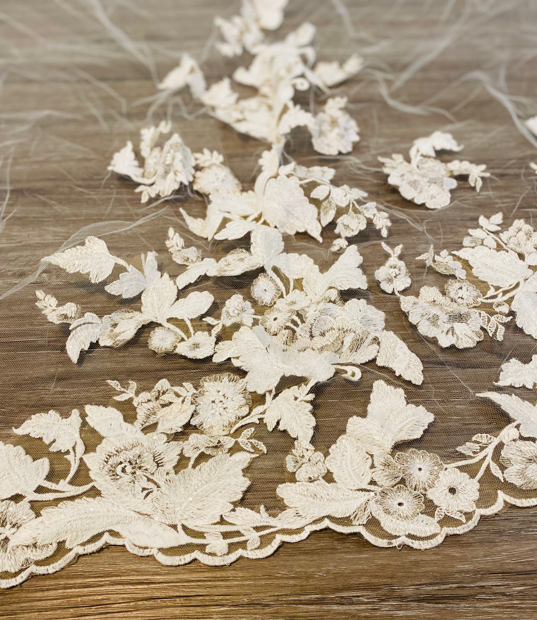 The Lilli veil is a stunning two layer cathedral veil edged in a champagne hued floral lace embroidery.
