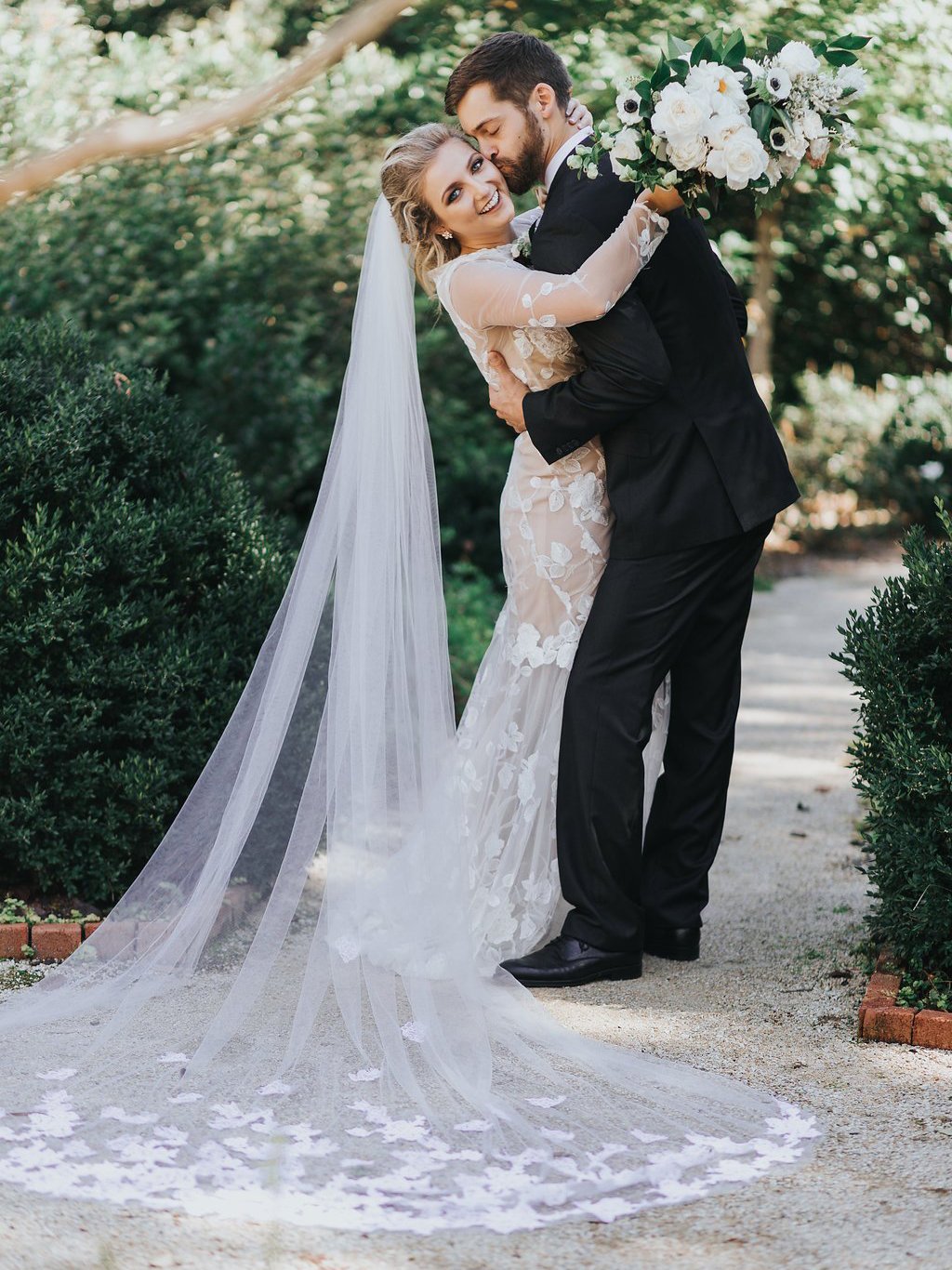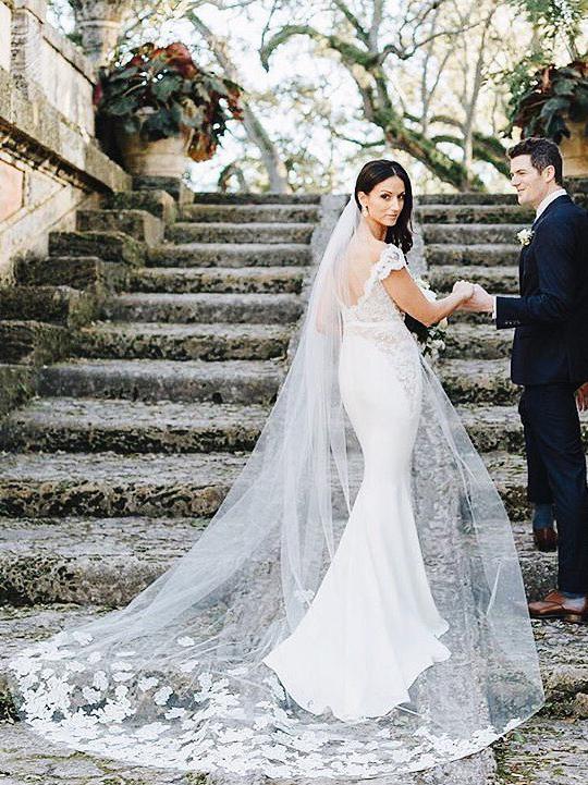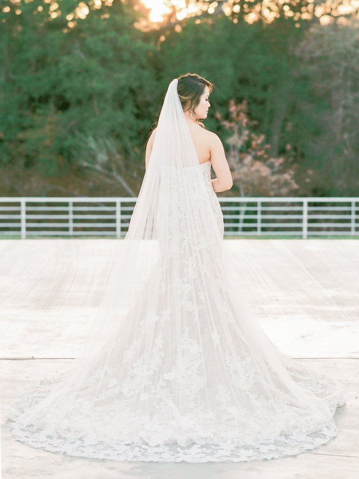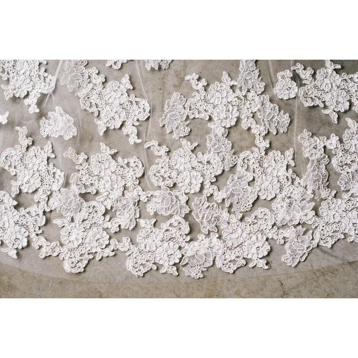 From garden to gala, this stunning veil will definitely make a statement on your big day- and just imagine your photos! This veil takes hours of meticulous hand-cutting and placing all of the individual pieces of Alençon and Chantilly lace that compose the gorgeous graduated scatter throughout this design. Genuine French lace appliques are very dense at the bottom 30" of this veil, then they gradually disappear mid-back