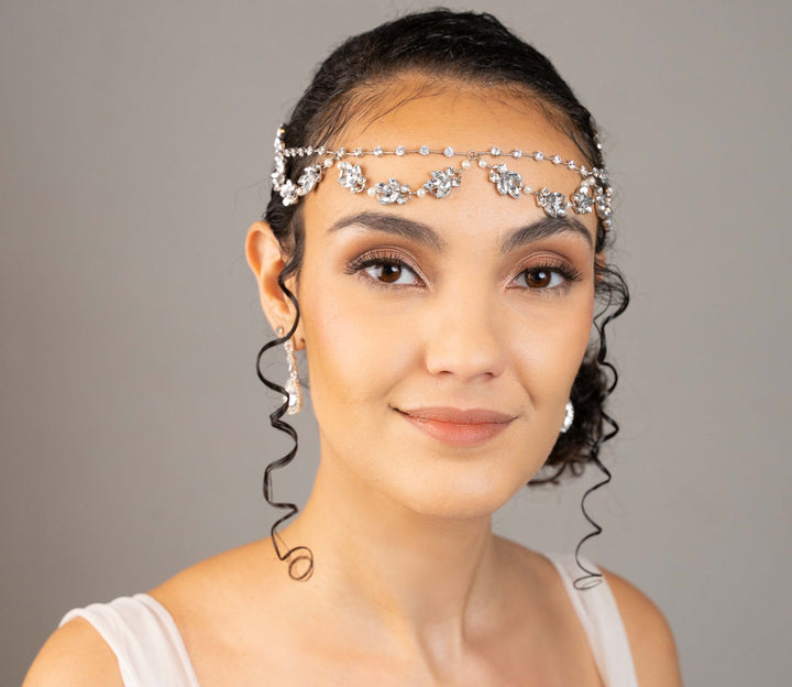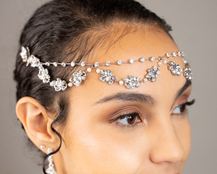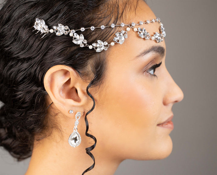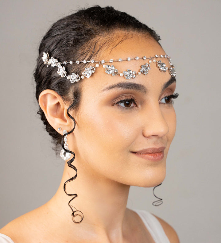 This headpiece is sheer feminine meets exotic with its chandelier design and dainty crystals complemented with floral crystal and pearl accents.  Can be worn a multitude of ways.  The miniature side combs offer versatility.