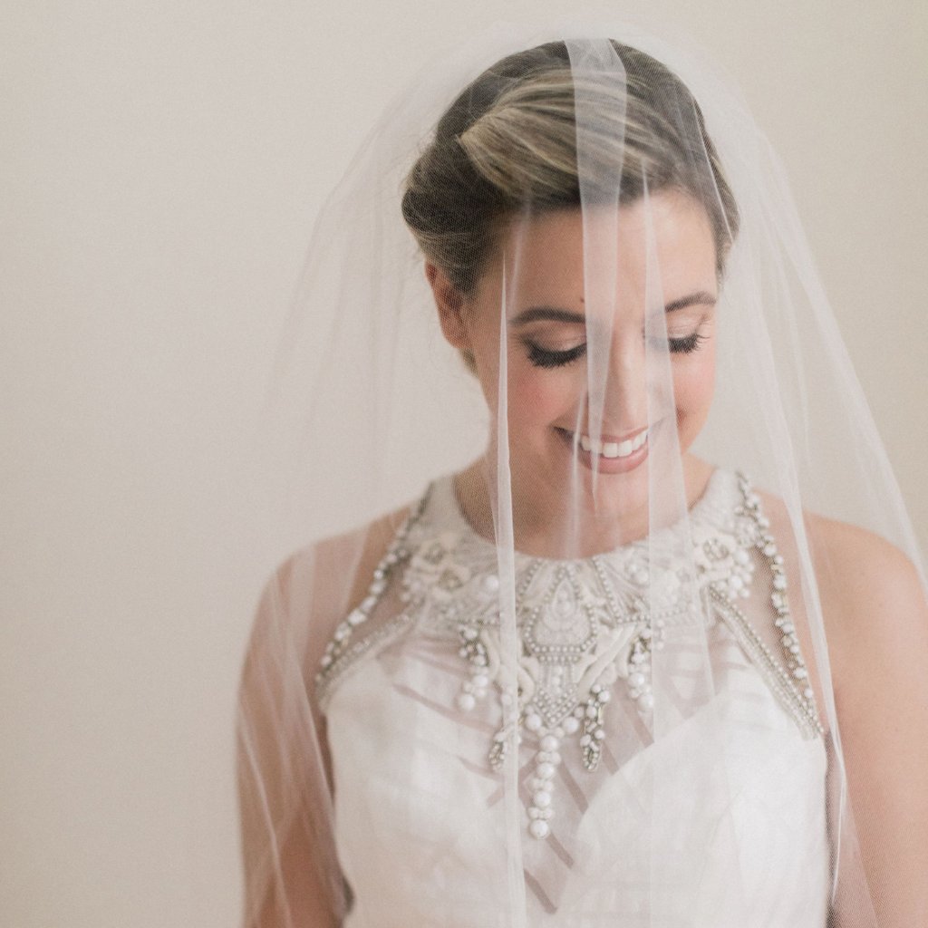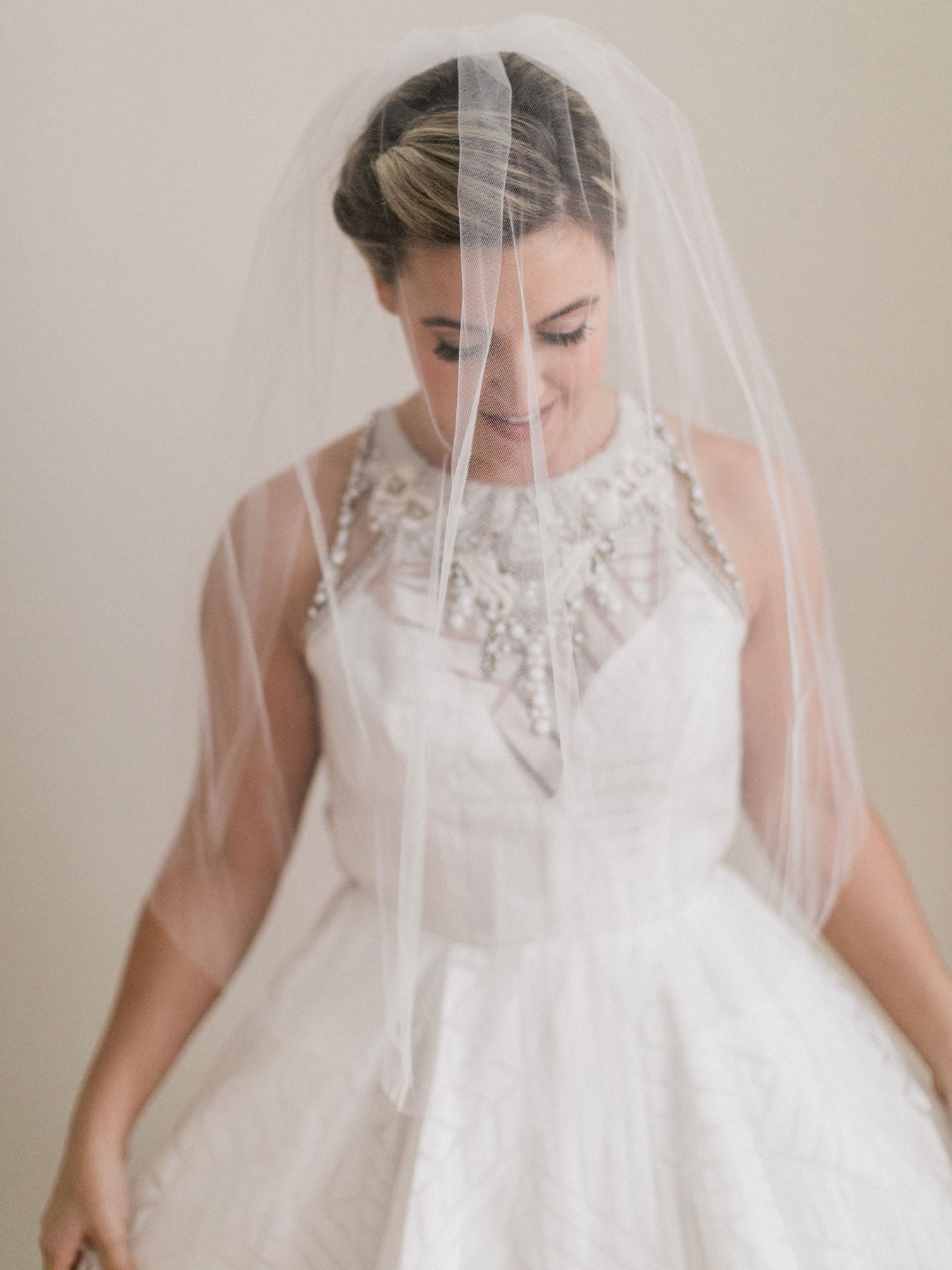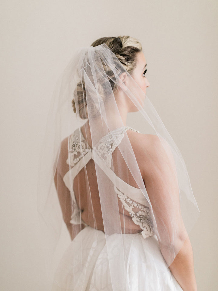 The most simple as they come. An elbow length, raw edge veil to make any gown turn into a bridal gown. You can add this piece as a blusher to any of our veils, or wear in the back. *Pictured in Diamond White*