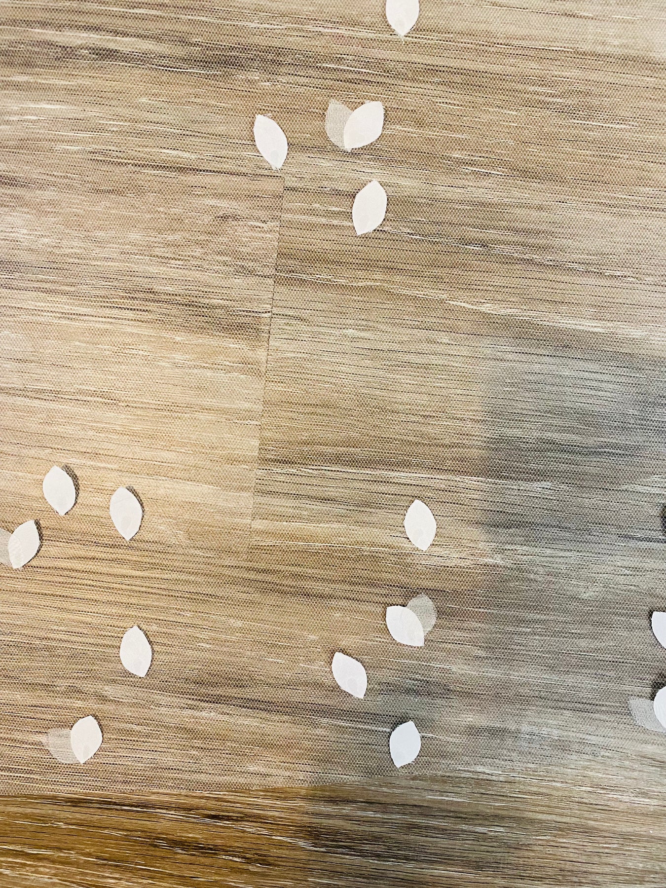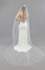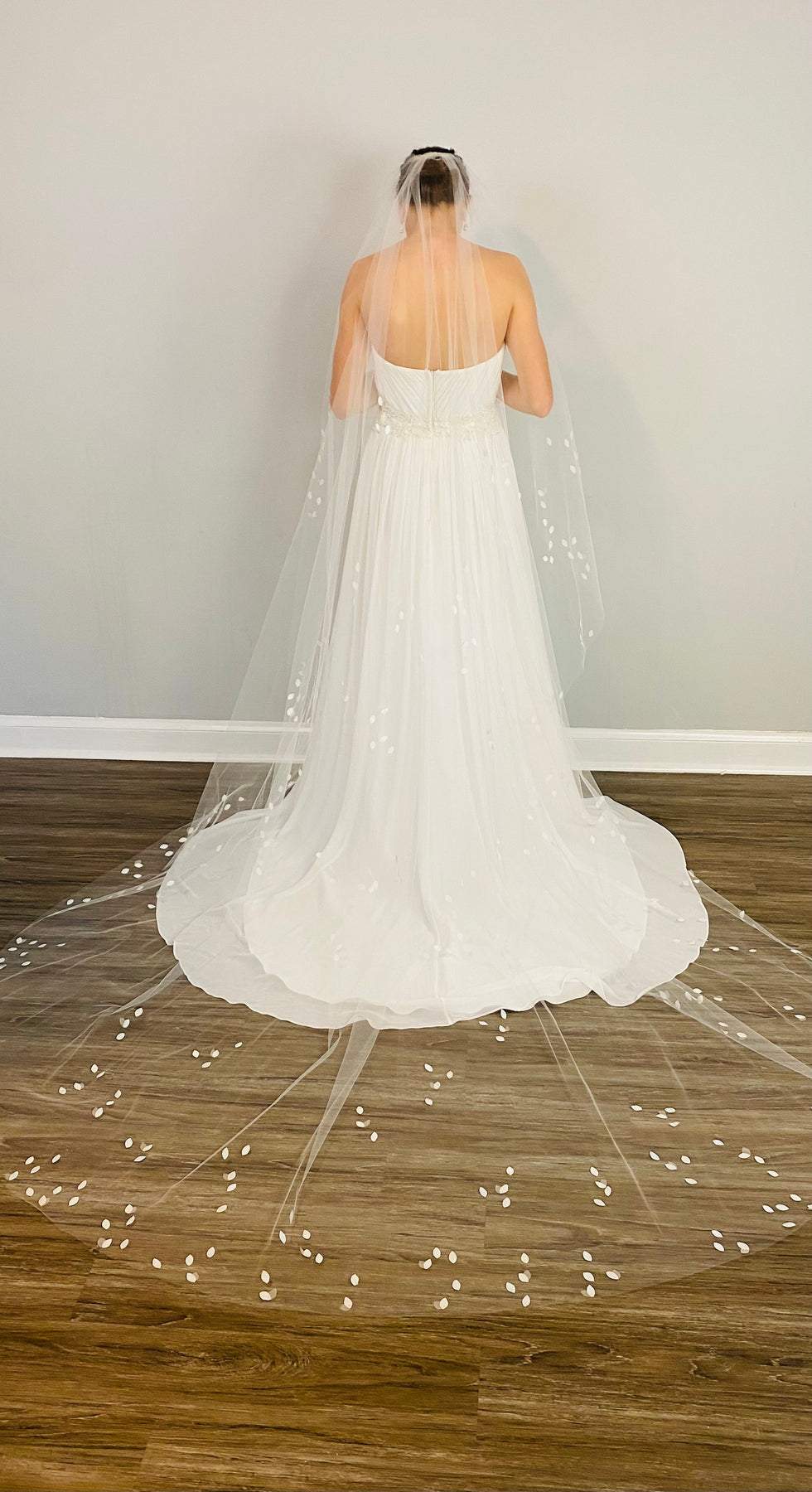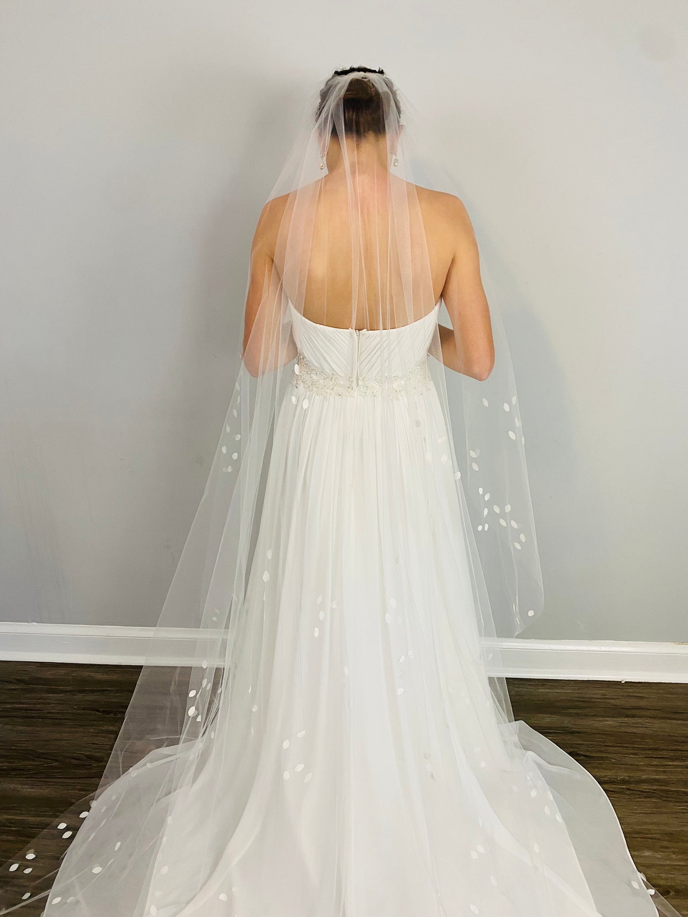 A single layer, chapel length, cascading and full width veil scattered with hand cut silk taffeta and organza leaves.