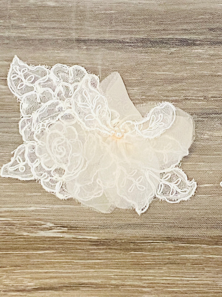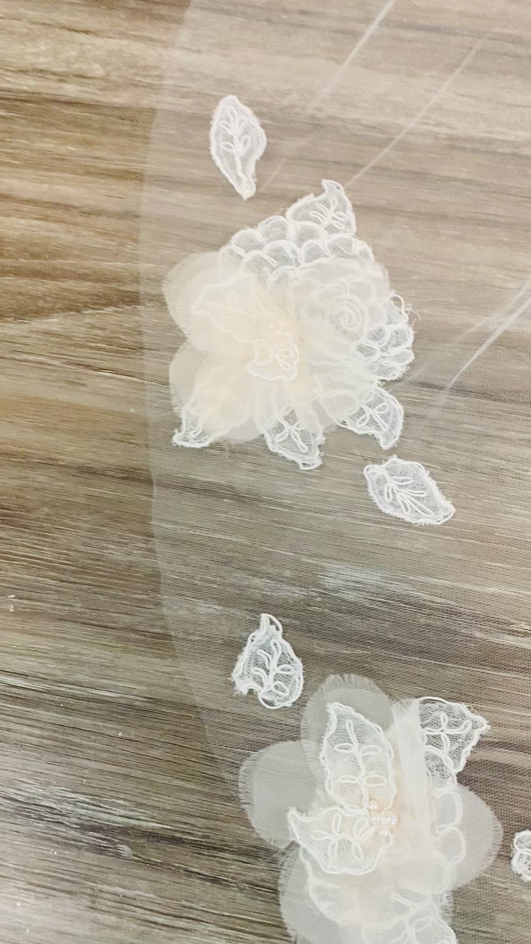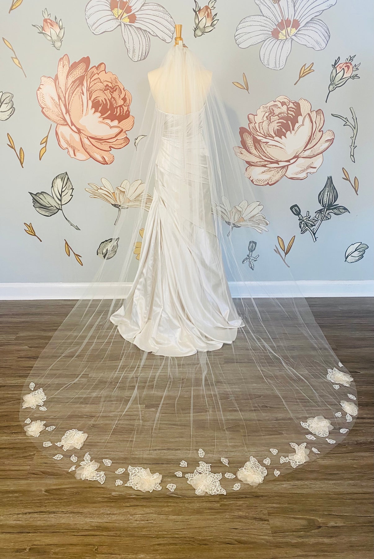 The Blake Veil is the essence of femininity.  This one layer cathedral length veil is finished with hand cut soft blush organza and lace floral motifs.