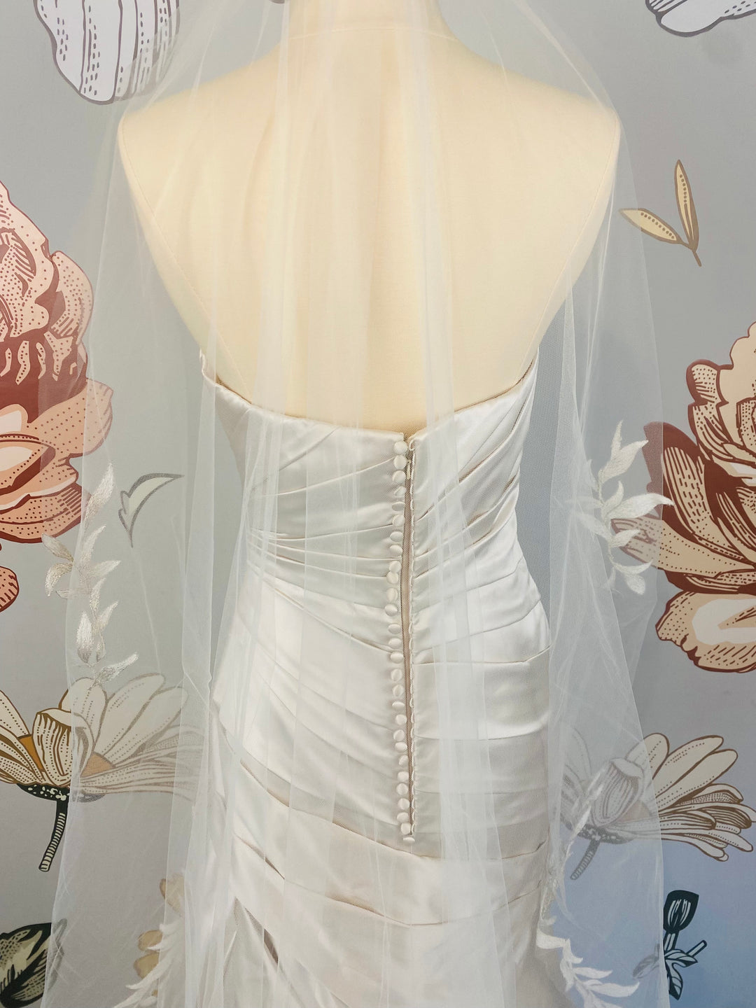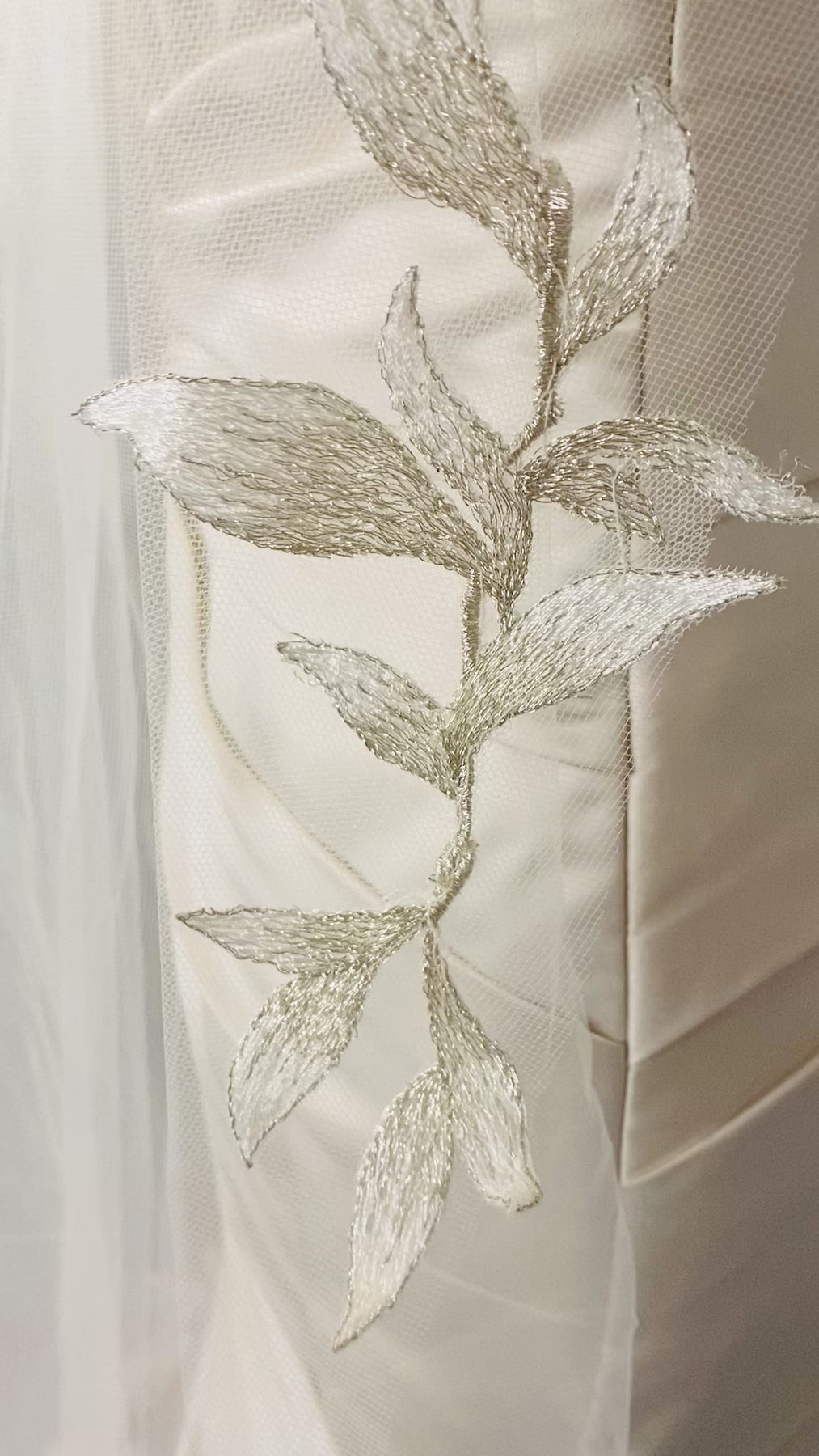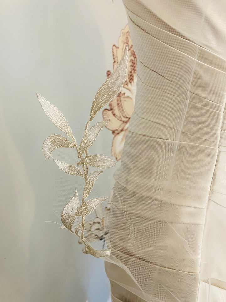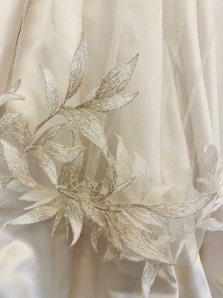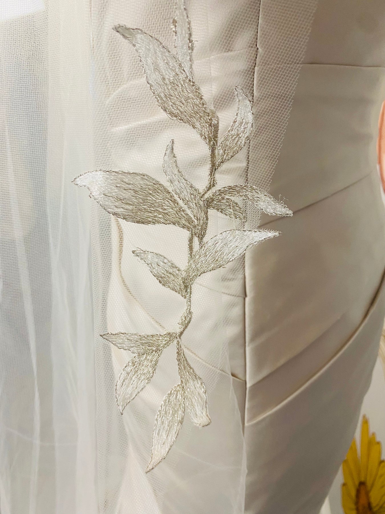 The Bree veil is a sheer street length full cut one layer veil with an eye-catching metallic embroidered leaf motif.