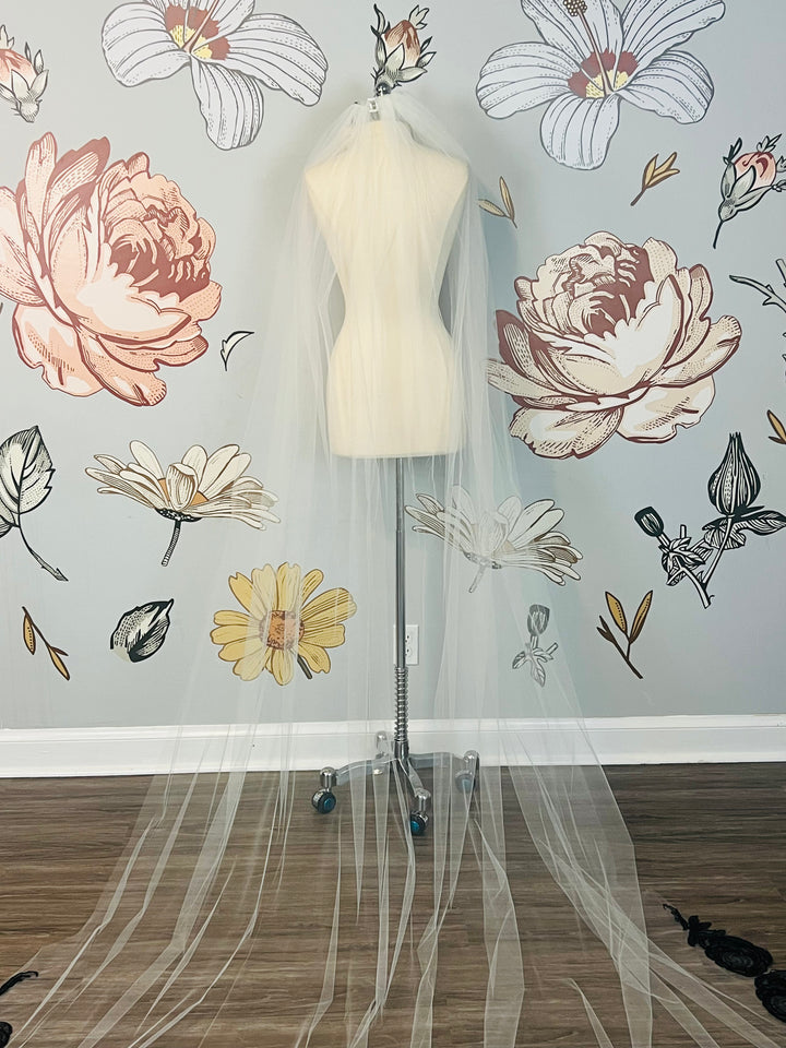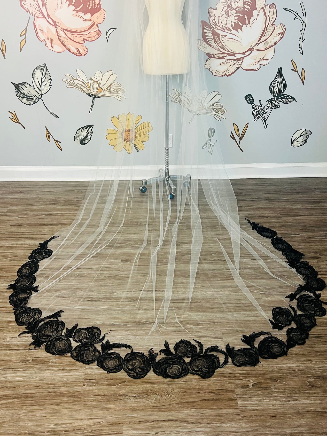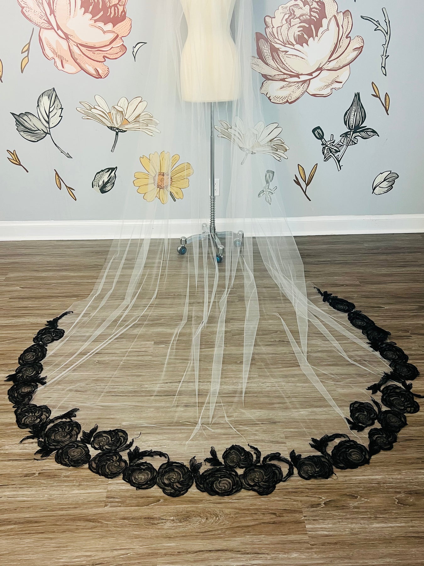 The Rhea veil is a one layer cathedral length veil with a dramatic trim of full black lace roses.