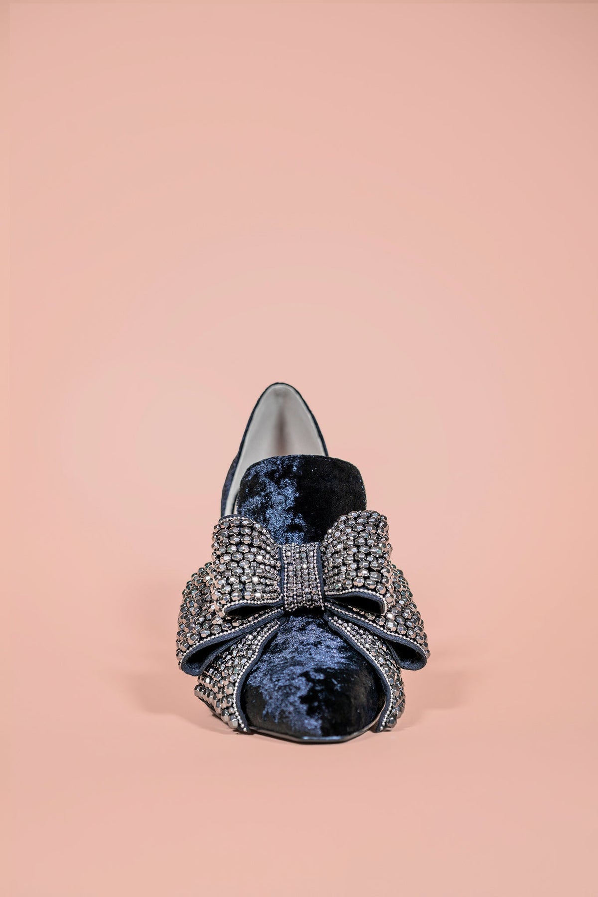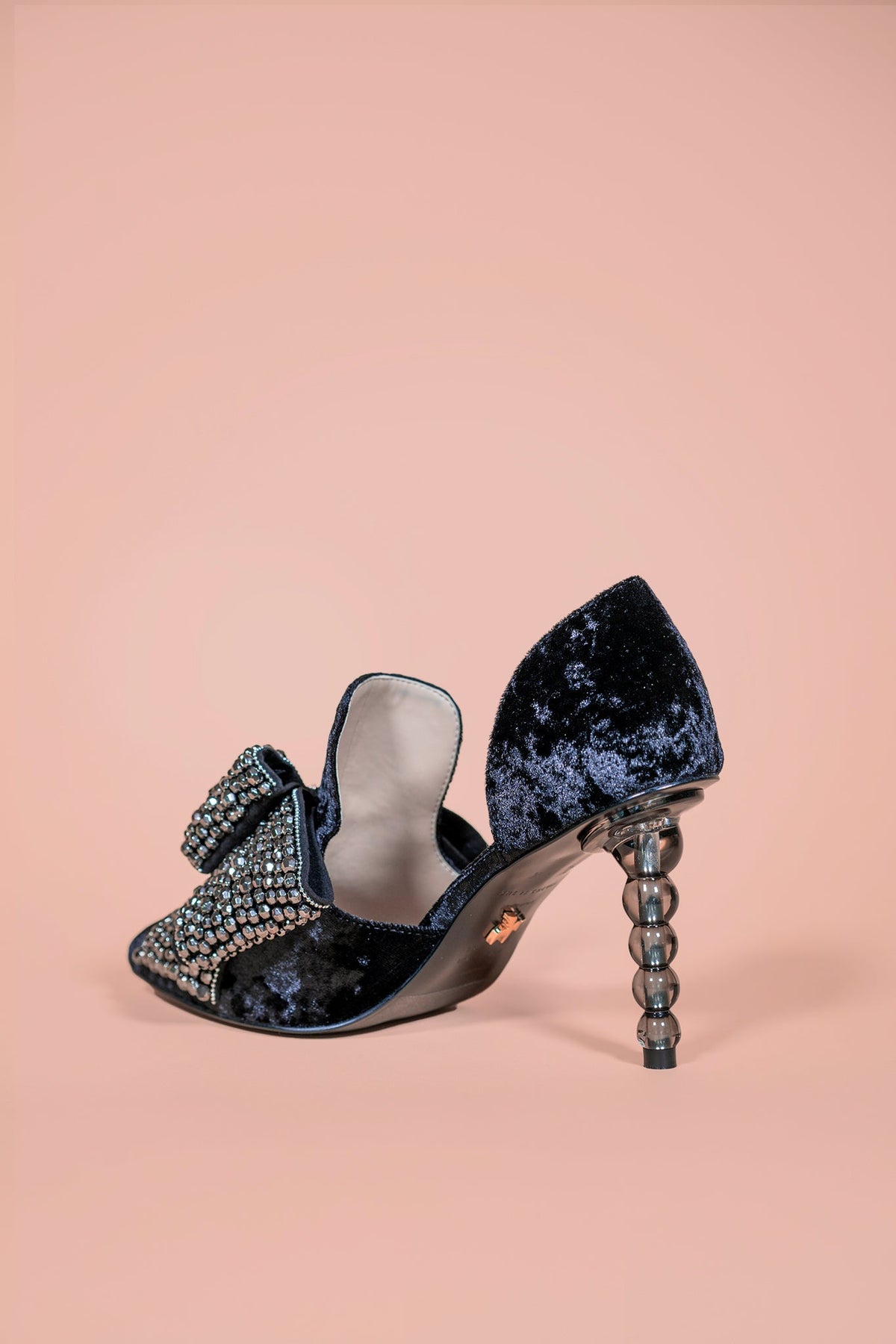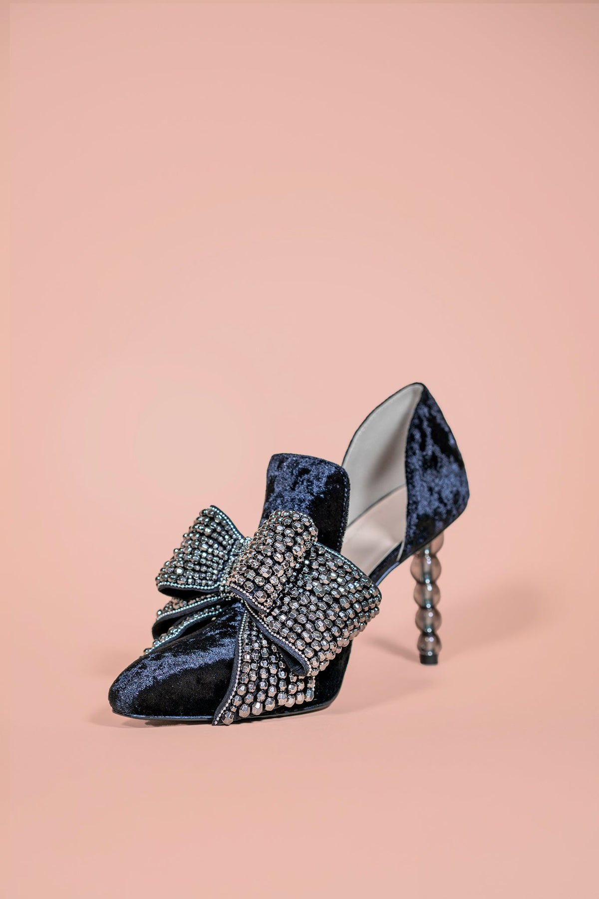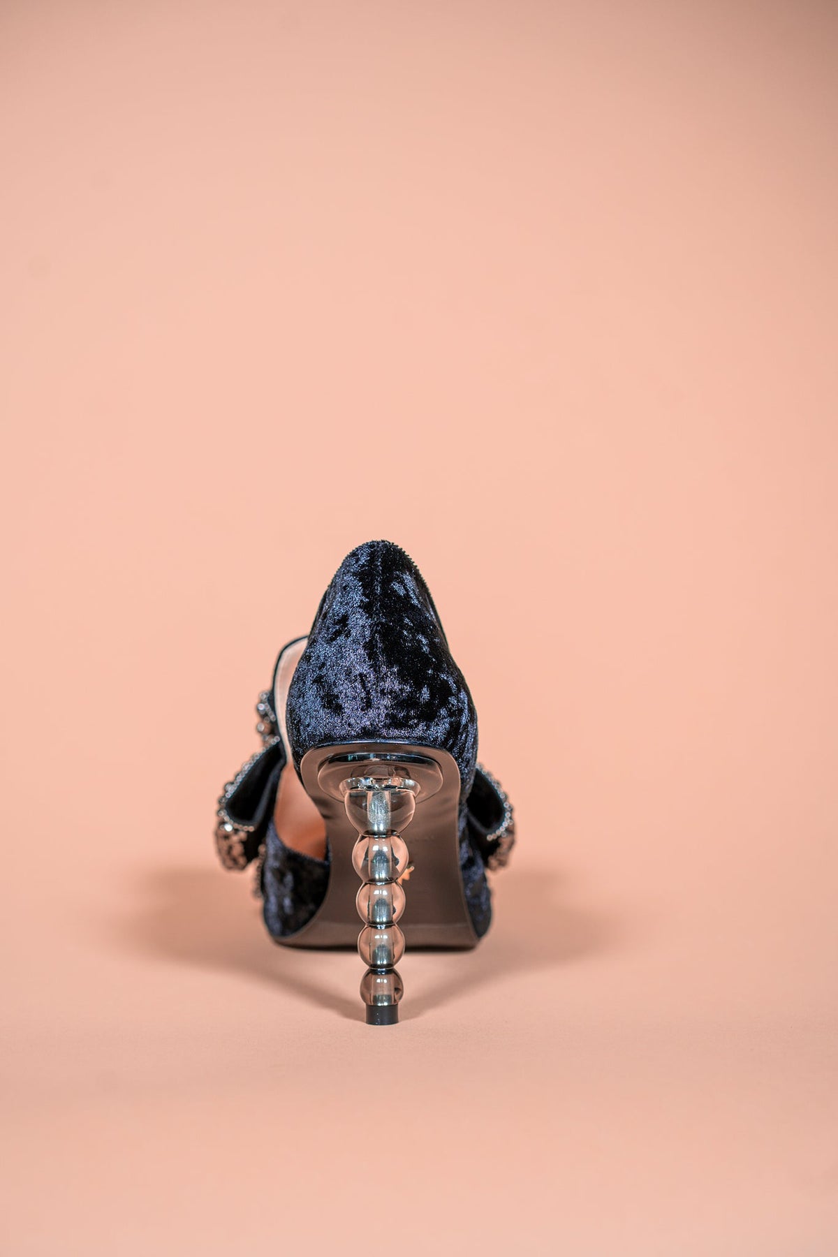 Lady-like and breaking a few rules: this snazzy statement shoe is velvety in feel, glittering in detail, and seductive in stacked acrylic. SHE IS both demure and defiant, and ready for EVERY. SINGLE. HOLIDAY. FIESTA.