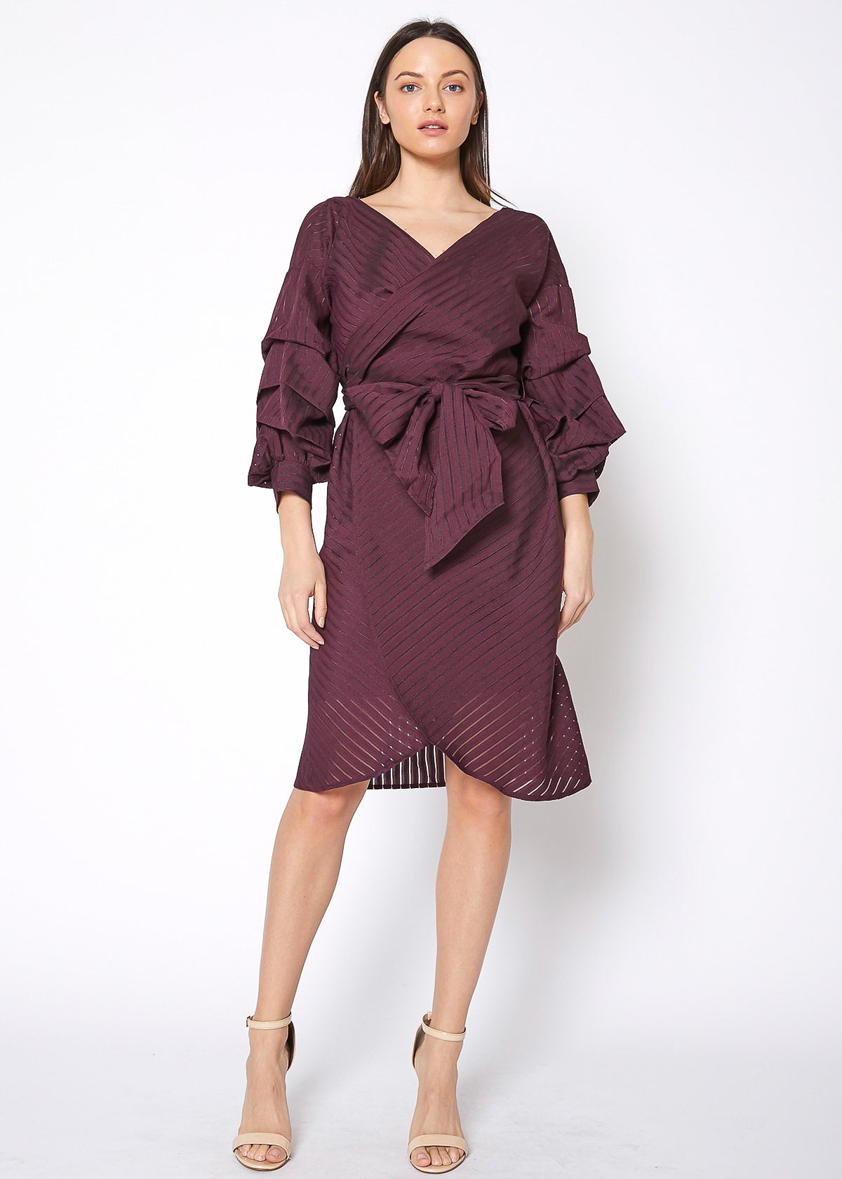 Organza Stripe Wrap Dress In Burgundy by Shop at Konus
