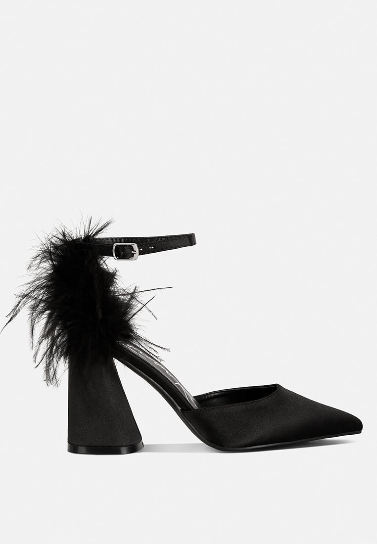 These flared block heel shoes are all about adding pizzazz and extra flare to your style. They feature a sleek and modern design with a unique fur counter detail that sets them apart. This distinctive touch adds a touch of luxury and uniqueness to your look.