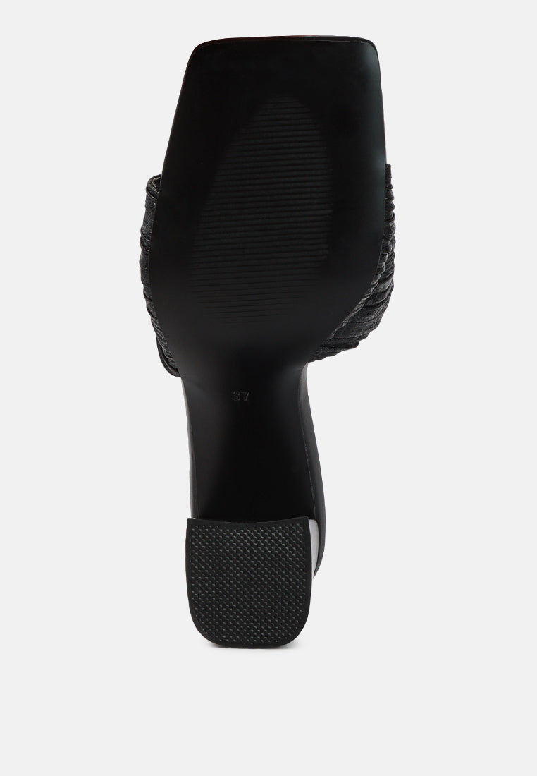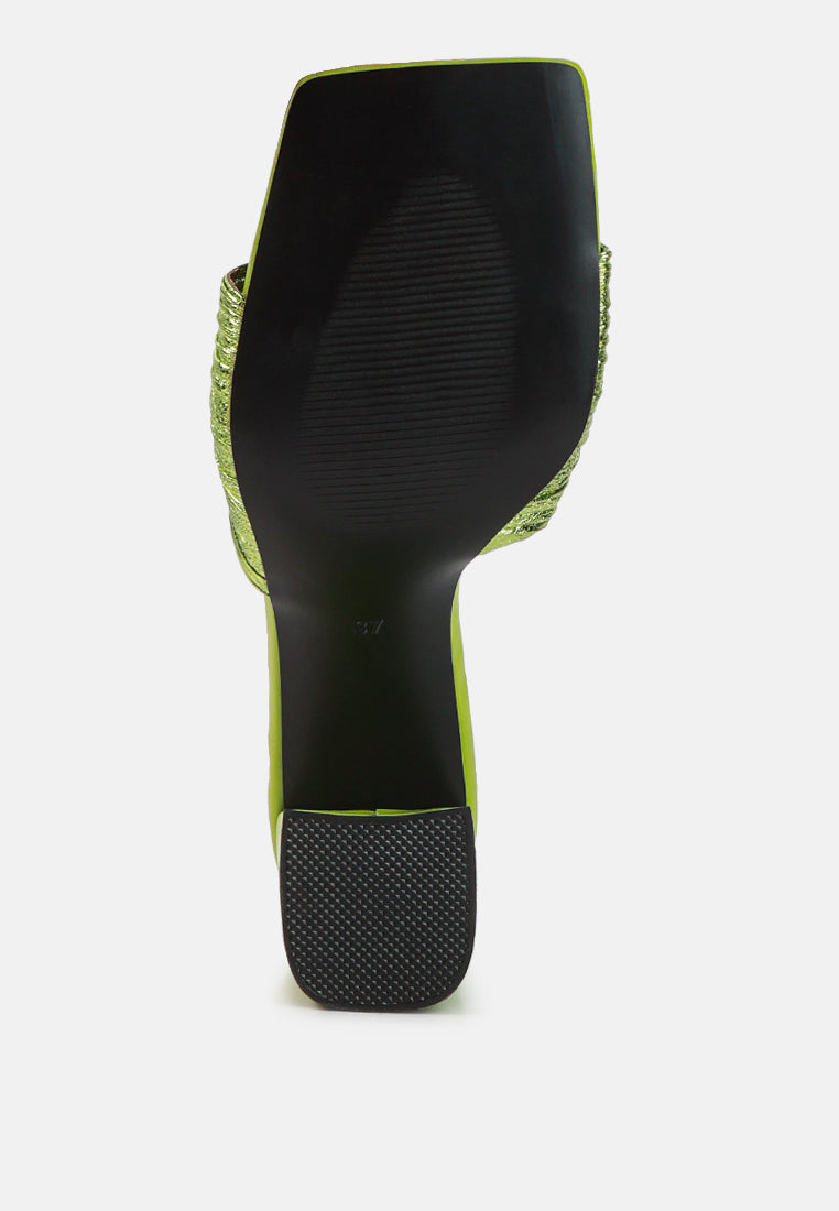 The high-heeled triangular block sandals feature an interesting crinkled strap at the toe of the shoe. The textured metallic strap adds drama, weight, and, of course, glitz and glamor, ensuring you're ready to hit the party scene in style.