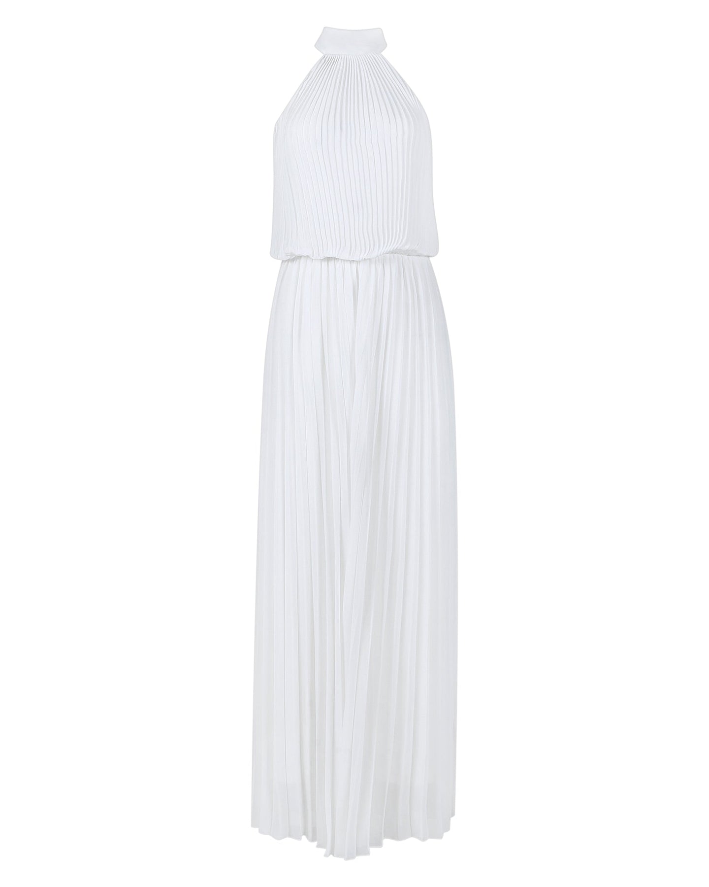 This goddess style jumpsuit features all-over vertical pleats and a sexy halter neck with an adjustable scarf tie. The true waist has an elastic gathering to fit a range of sizes. The fabric is a sheer chiffon with a clean, white hue. This jumpsuit is fully lined.