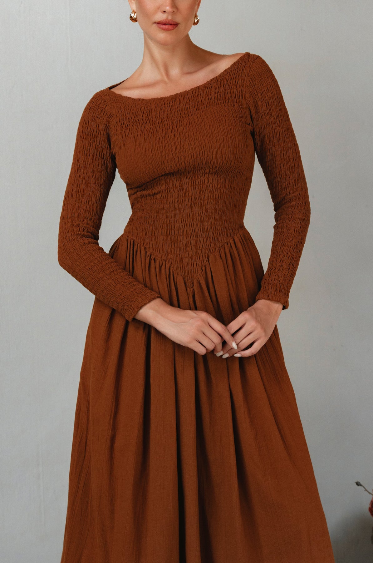 Brown smocked dress with long sleeves on a neutral background