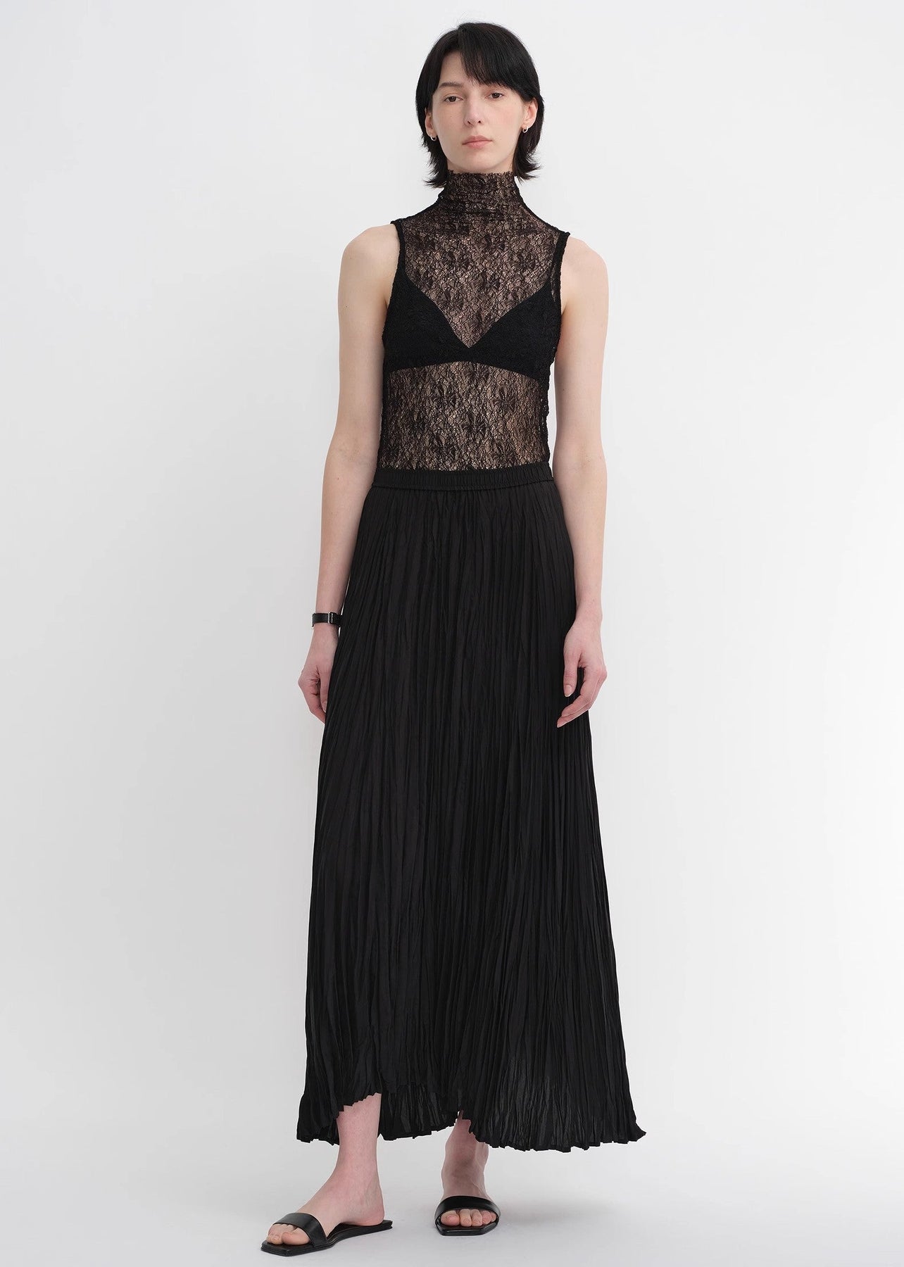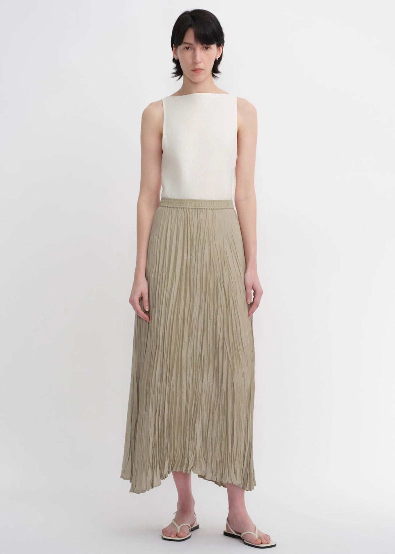 High-quality mulberry silk with a luxurious and elegant sheen. Stylish three-dimensional pleats. Skin-friendly, smooth, and comfortably inclusive. An irregular hem for a dynamic and stylish look. An elegant slightly A-line cut that is slimming, elegant, and casual.
