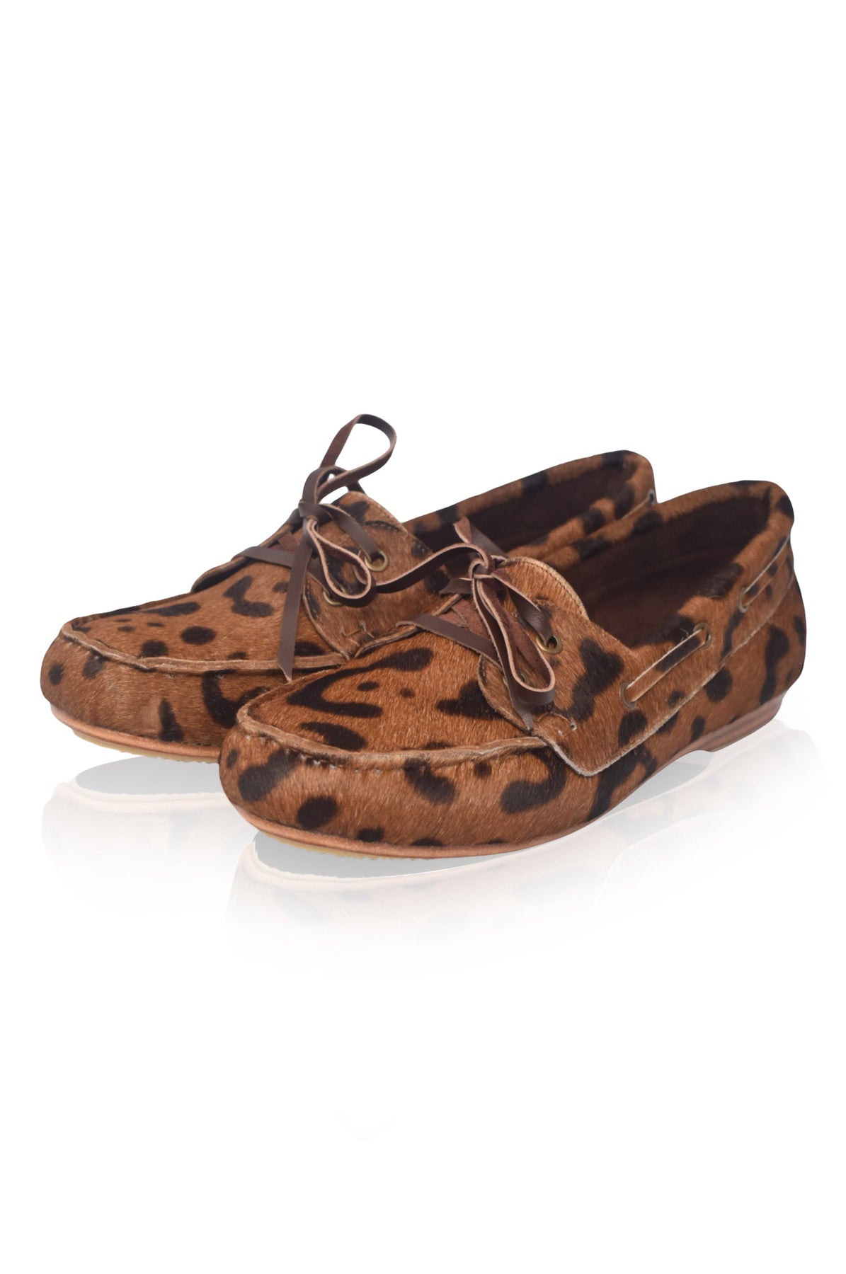 Brown boat shoe with leopard print pattern on a white background
