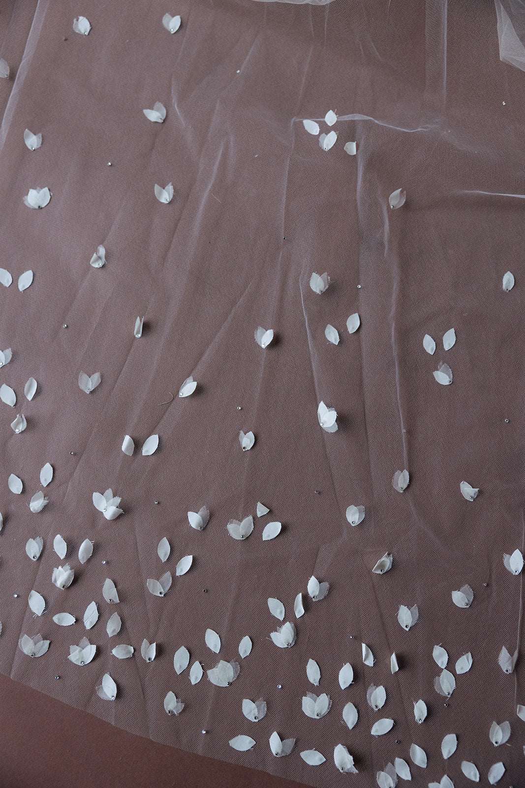 This ethereal cathedral veil showcases meticulous artistry with delicate crystal leaves artfully distributed across its expanse and dimensional leaf embellishments adorning the perimeter. A single-layer design that captures an enchanting, nature-inspired aesthetic, making it an ideal choice for couples envisioning a whimsical garden celebration with an air of mystery and elegance.