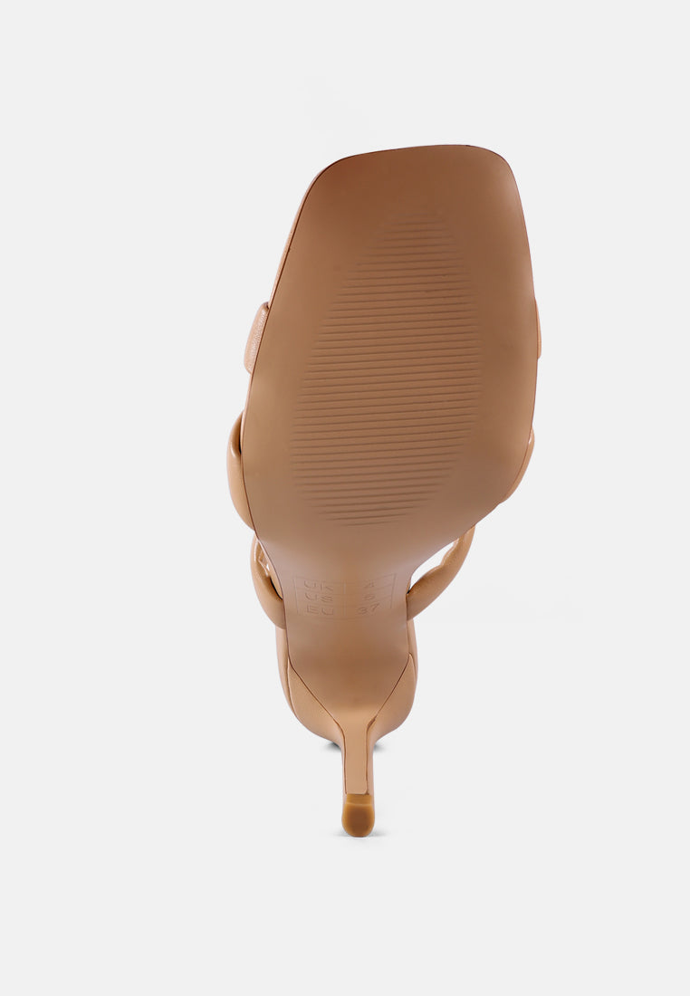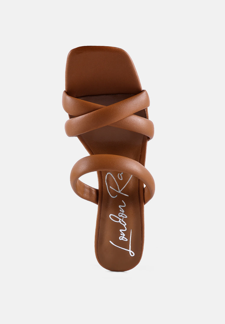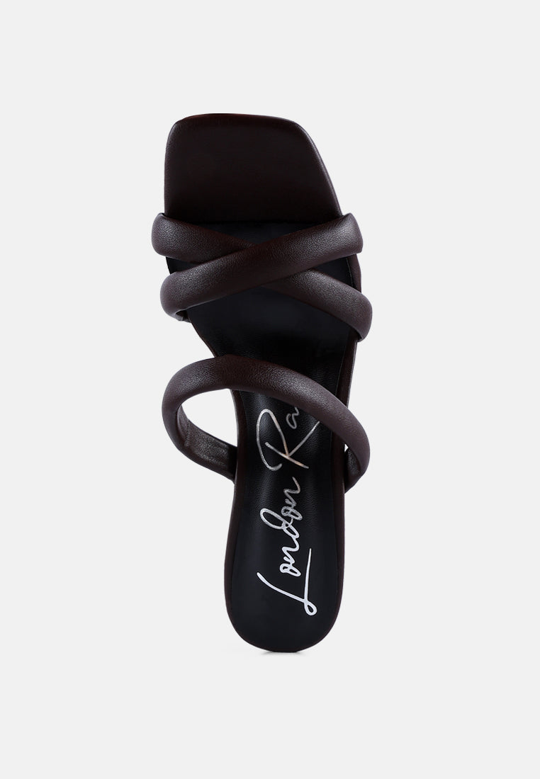 These high-heeled sandals slip-ons are comfortable with soft cushion innersole. The criss-cross puffed straps on the front are an elevating element. The sandals are trendy and versatile, ideal for almost any occasion and outfit.
