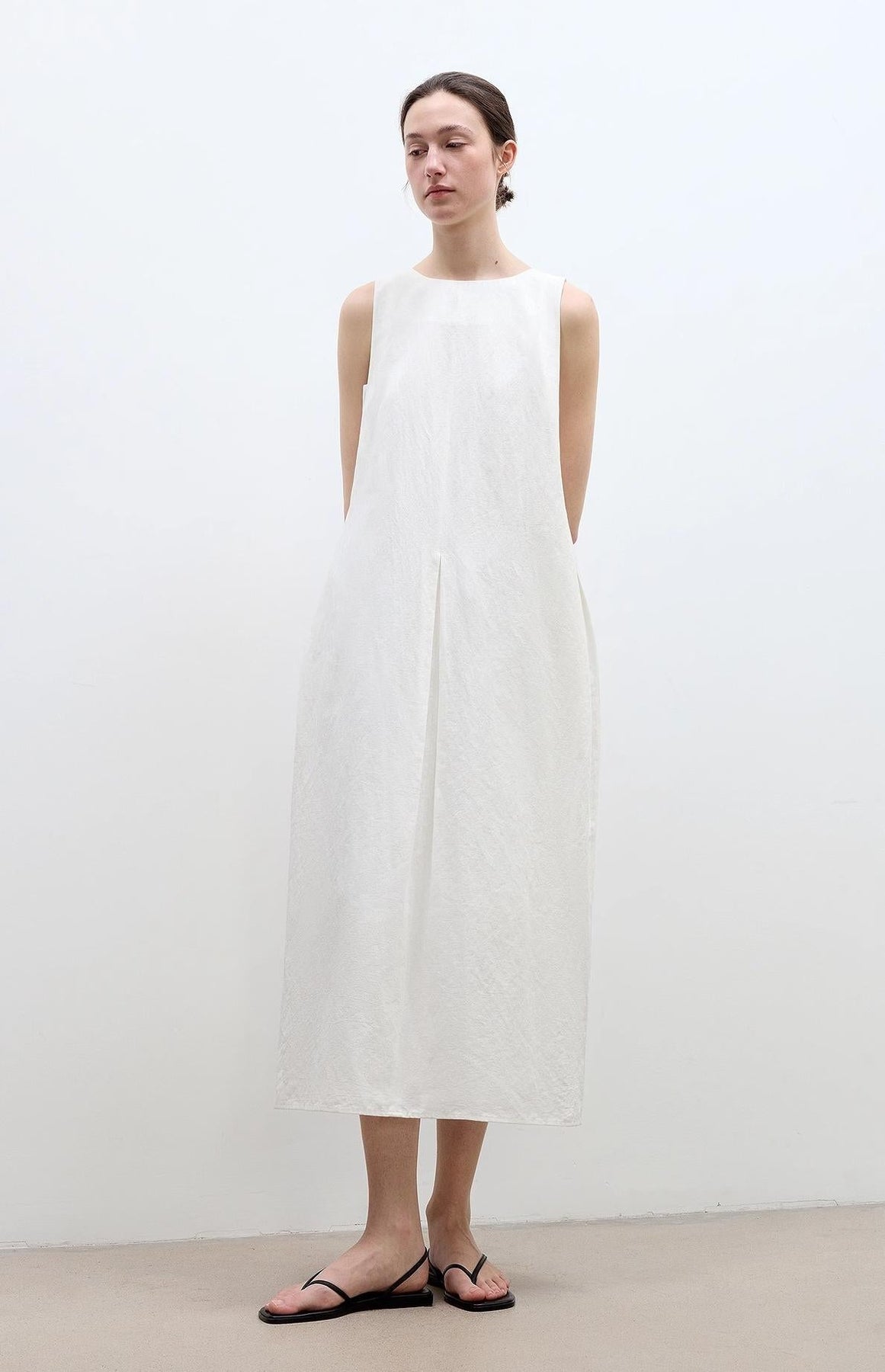 The designer said: The refreshing and breathable cotton and hemp blended fabric is comfortable and non-sticky. The smooth and simple hourglass-shaped skirt is elegant and romantic. The pleated design details on the sides and the front echo to increase the dimension and shape of the skirt. The skirt is more graceful and three-dimensional, and it is more light and elegant when paired with a sleeveless shape.