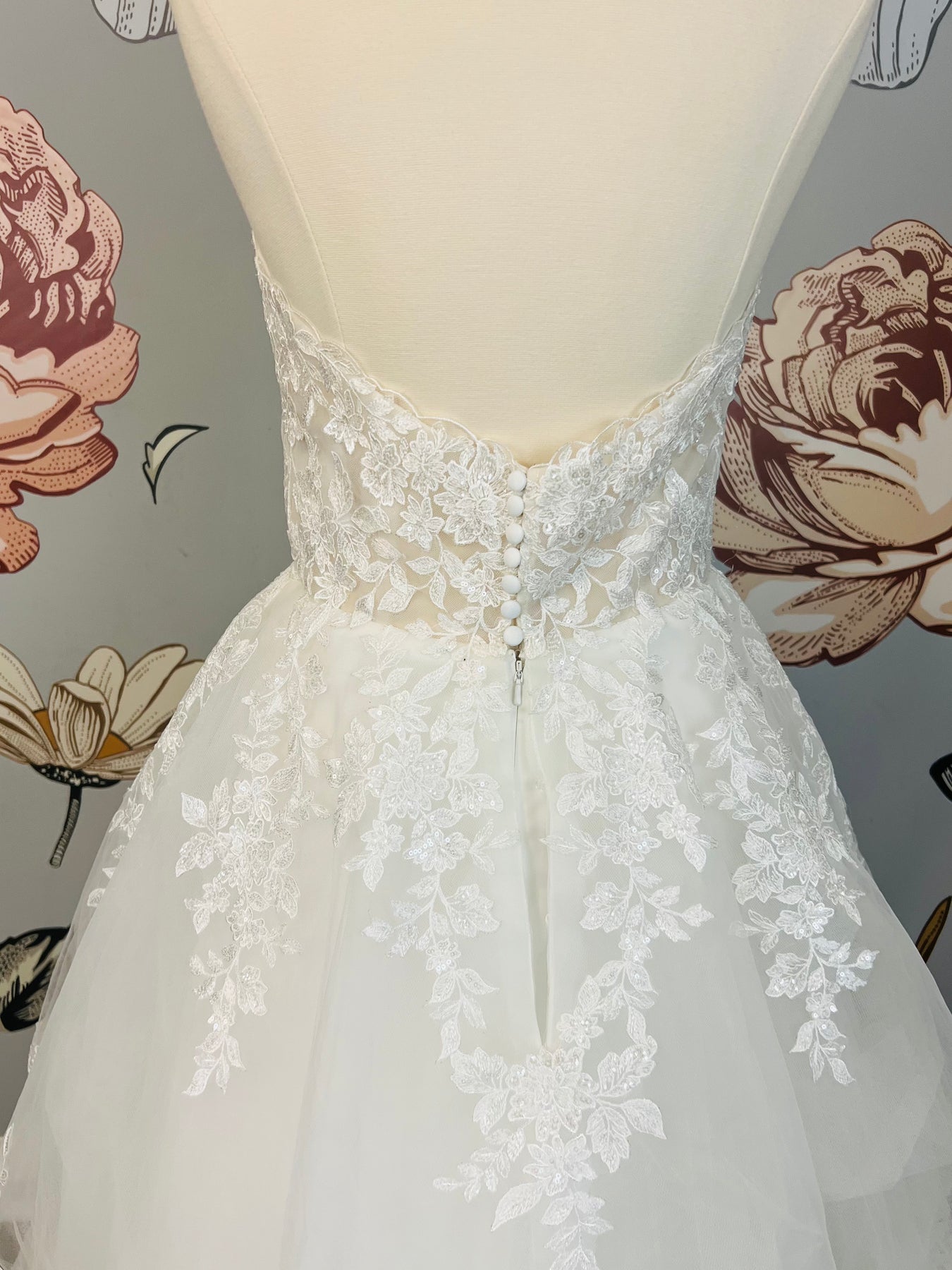 Style 22106 offers a whimsical display of tulle tiers, graced by lace trimming. The strapless bodice, delicately curved, features an exquisite lace overlay atop a nude-hued underlay.