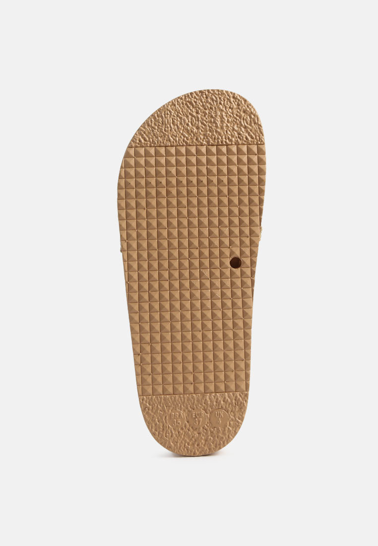 With molded footbed in quilt design, the pair of beautiful slides have shiny metal chai on top. Looks gorgeous on the feet and is a trendy design.