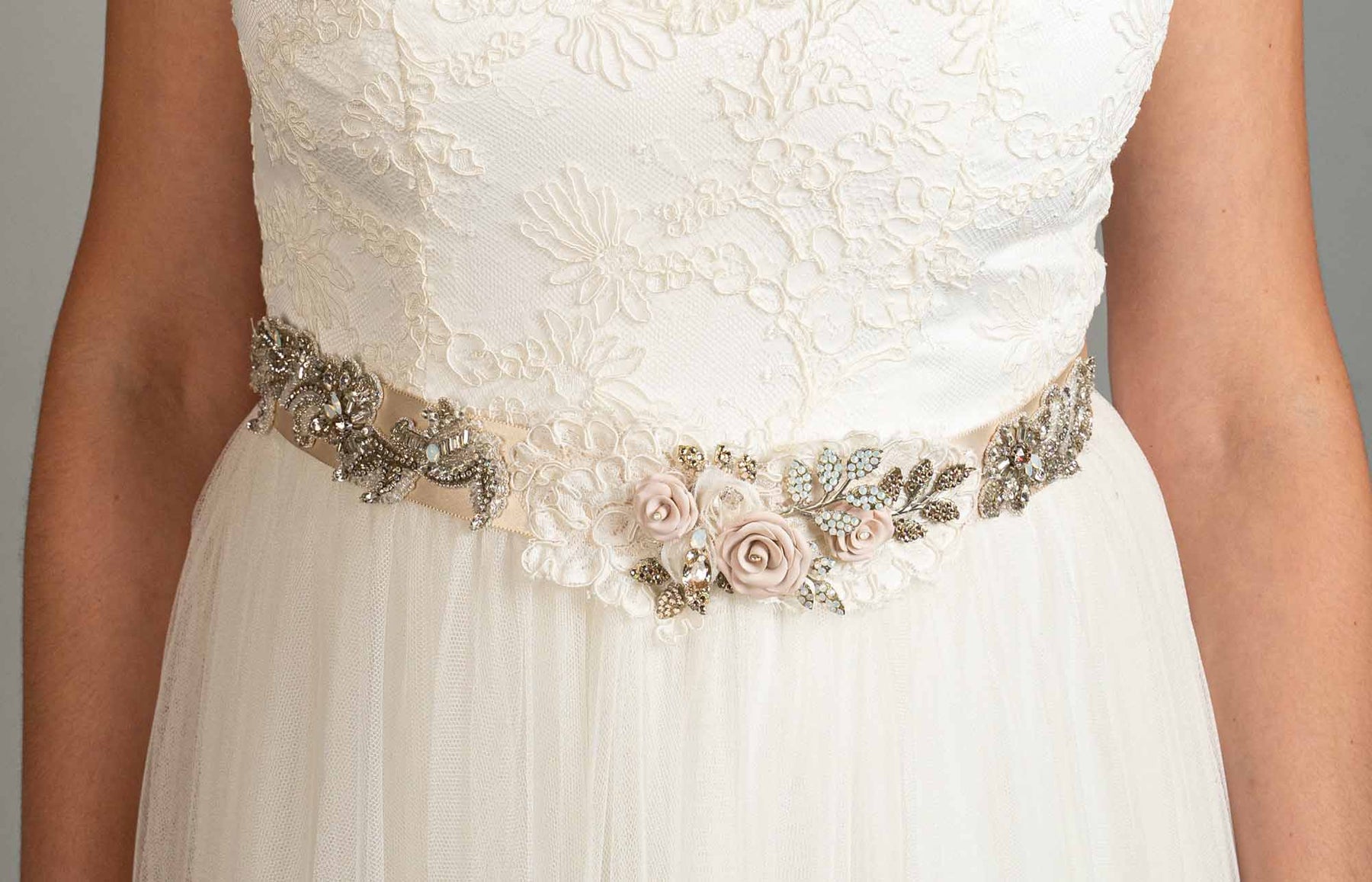 This duchess silk champagne toned belt is delicate and elegant in it's detailing.  Ceramic rosettes are flanked with delicate beadwork and Alencon lace.  There isn't a more stylish and romantic accessory to highlight your waistline.