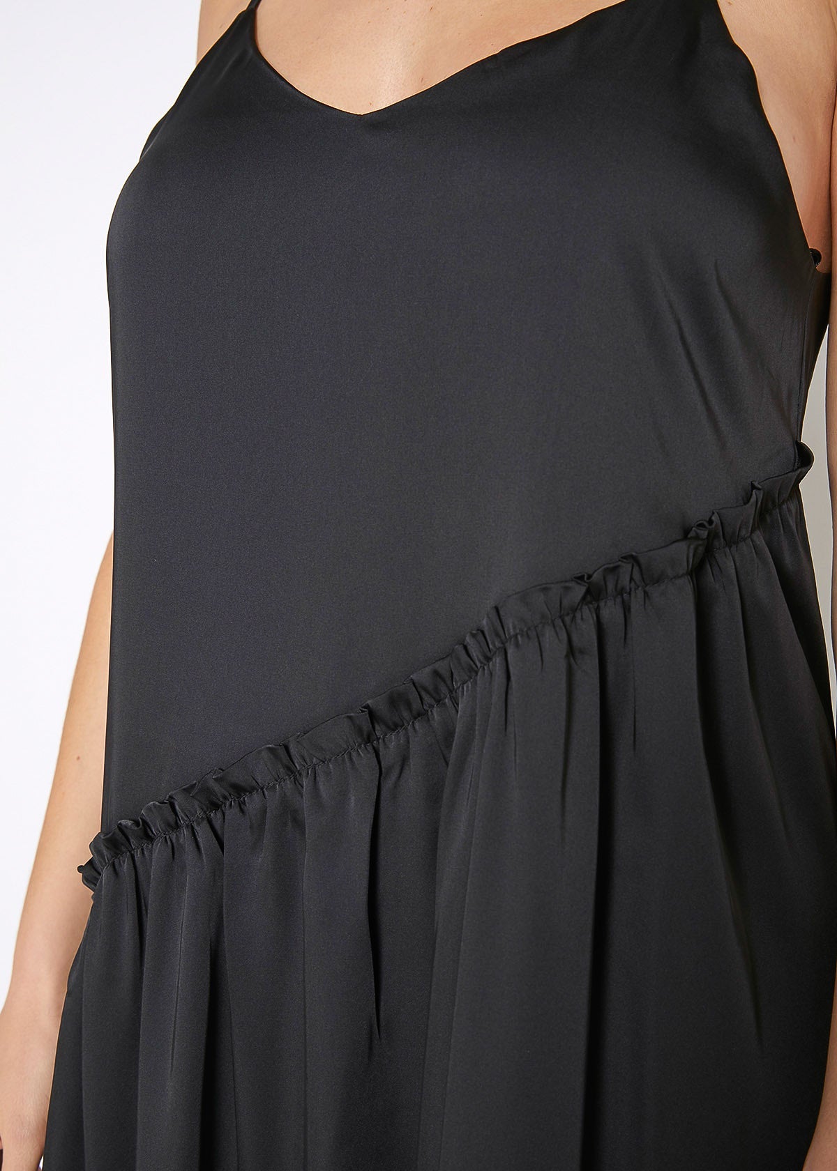 Women's sexy spaghetti strap maxi dress with diagonal ruffle patched detail.