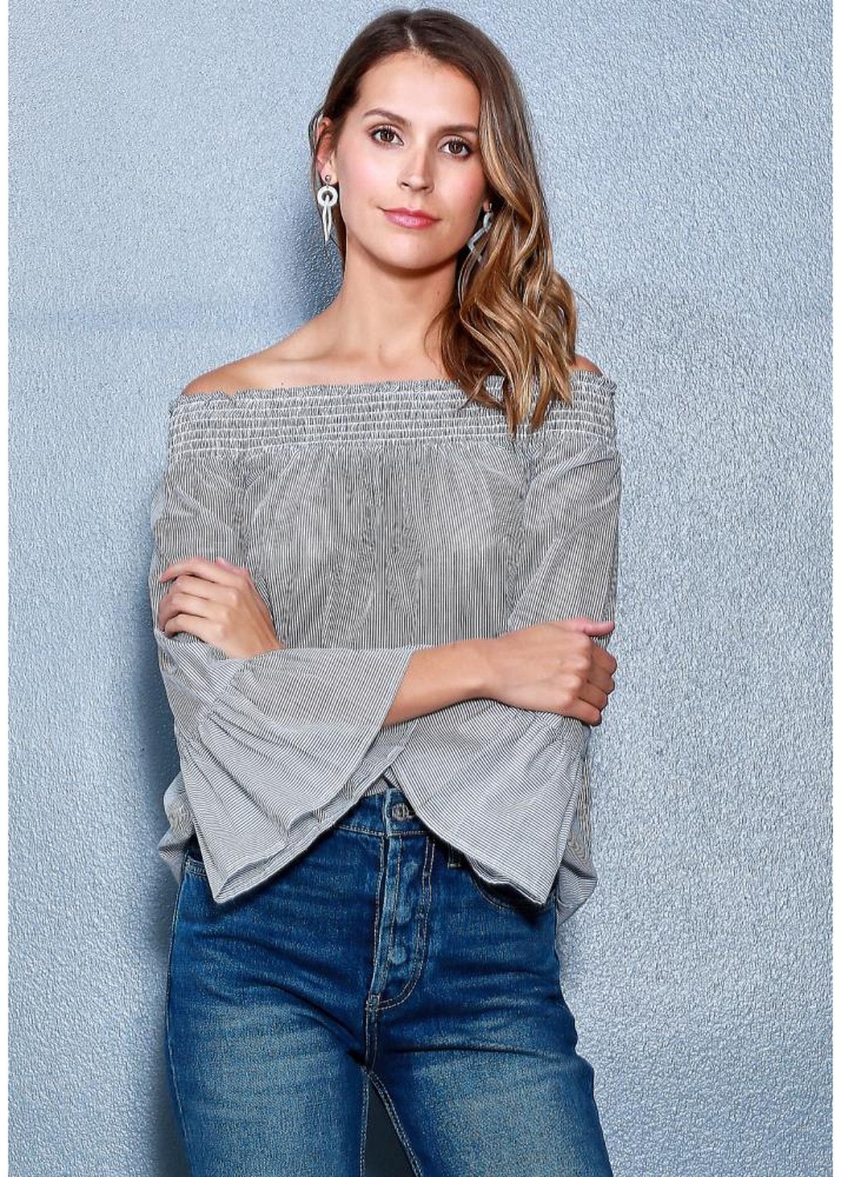 Women's Smocked Off Shoulder Top. This sensual piece boasts smocked shoulders and long sleeves with flared bell cuffs, for a touch of sophistication and allure.