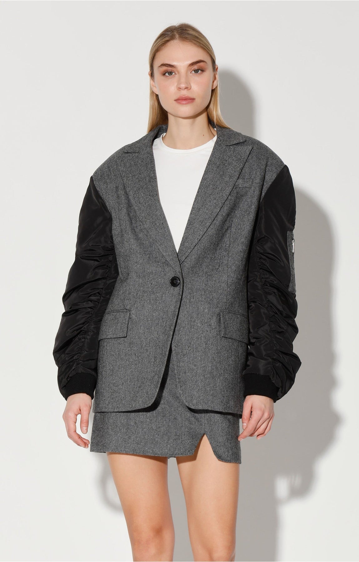 Notch collor; Single breasted single button closure; Easy fit bodice; Flap hip pocket detail; Chest welt pocket; Drop shoulder; Shirred puffer sleeves with elastic cuff; Sleeve zip patch pocket