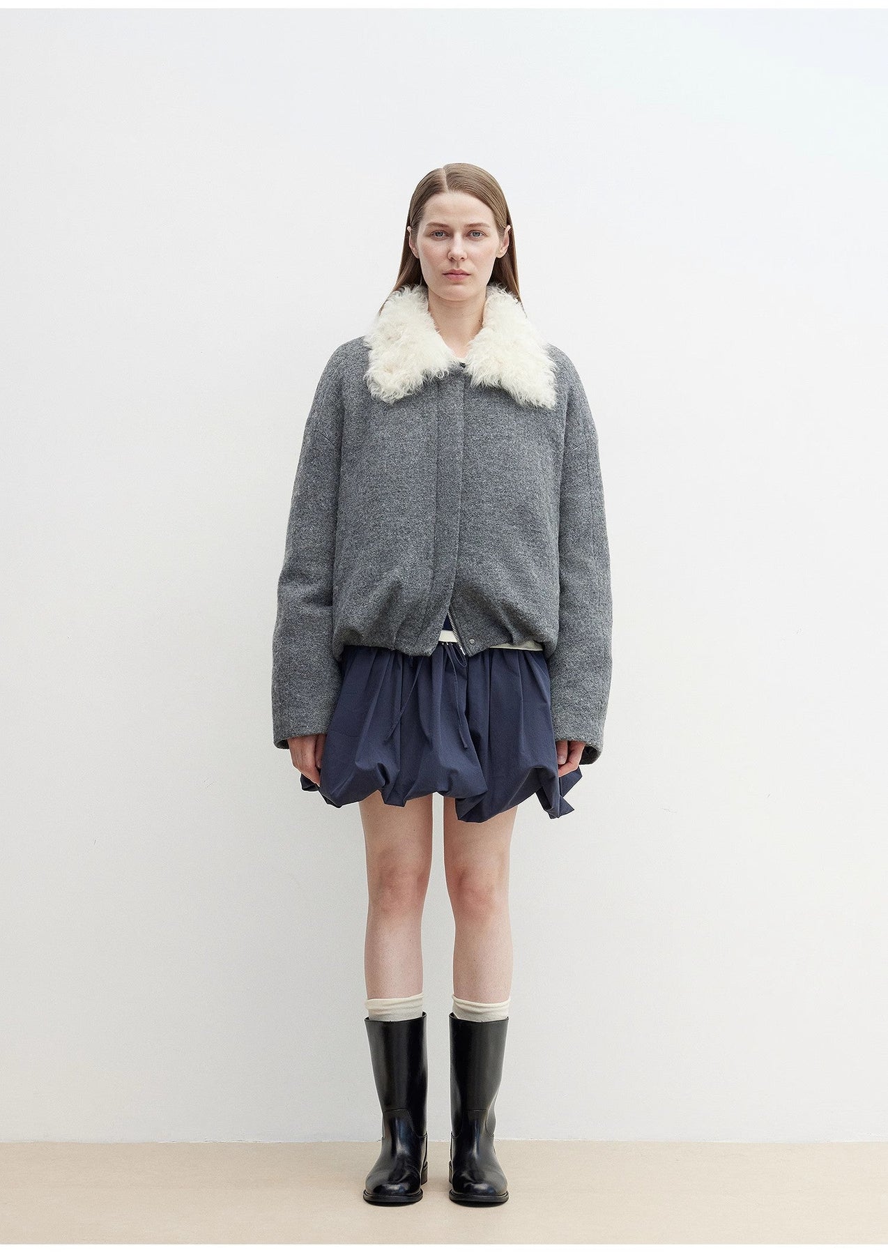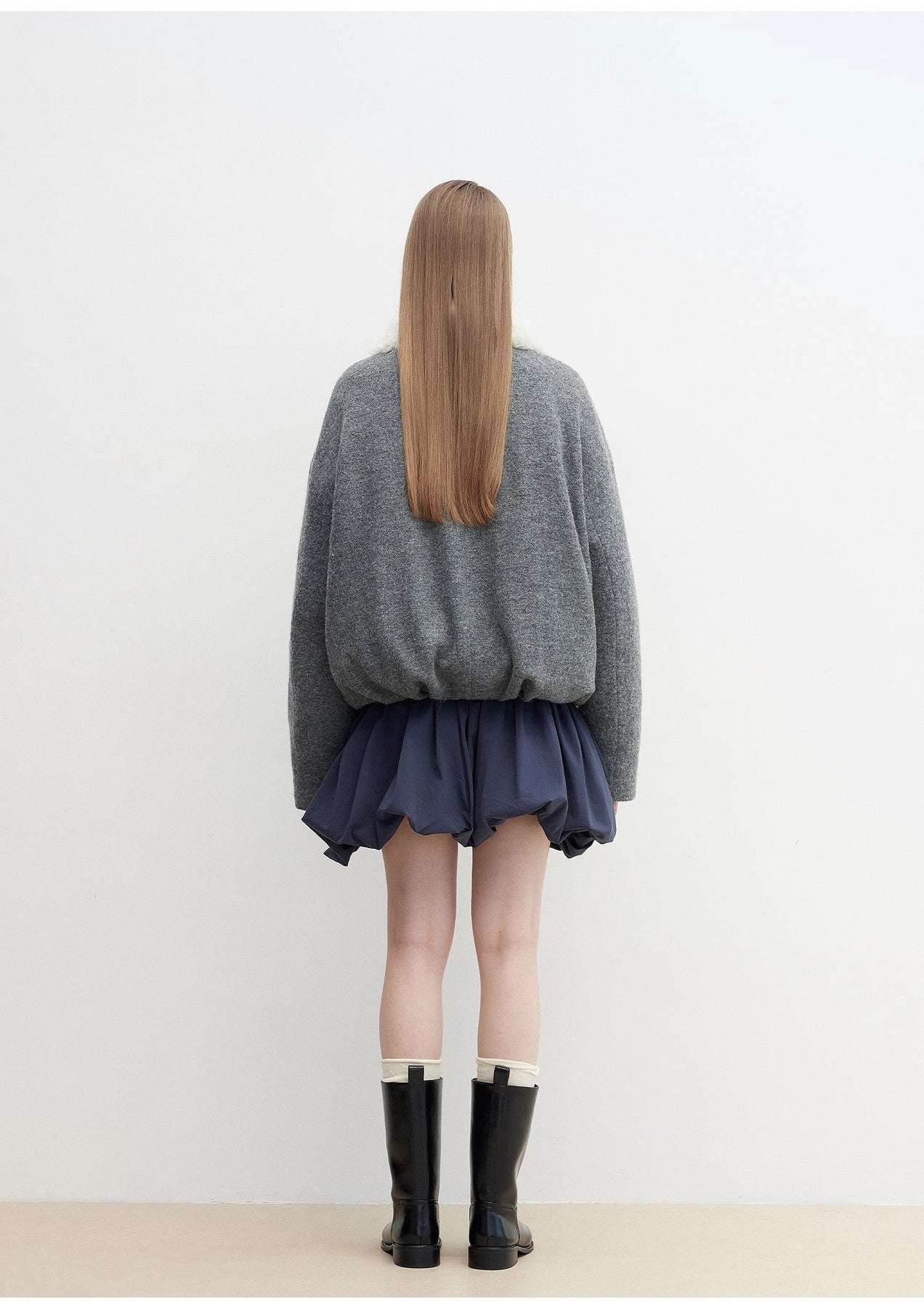 The wool-blend woolen fabric has a thick and full feel, and the detachable down lining is warm and light, comfortable and practical. The detachable Tuscan curly lapels are warm and stylish, modify the face shape, and reduce age. The pleated design at the hem adds layering to create a full, balloon-like shape. The body is relaxed and stylish and can easily reduce age.