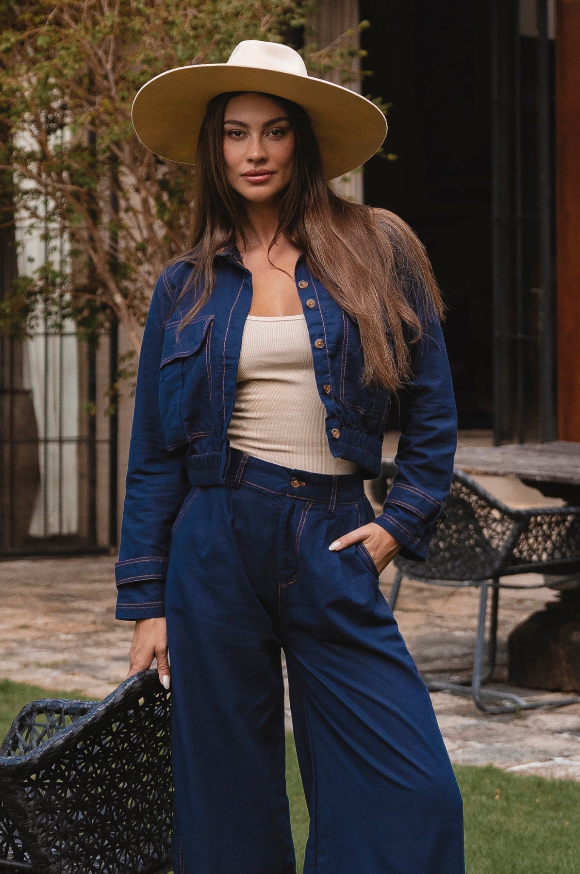 Woman wearing a blue denim outfit with a beige hat in an outdoor setting