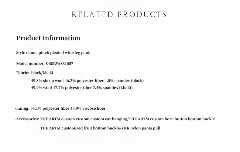 Imported high-quality Australian wool blended fabric, clear texture, dry and smooth, easy to care for, skinny and stylish, high-end tailoring to create a high and slim wide-leg pants shape, double pleat shape is elegant and stylish, showing a quiet and luxurious temperament, skinny and smooth luxurious texture, minimalist and high-level details tailoring, creating a high and intellectual female image.