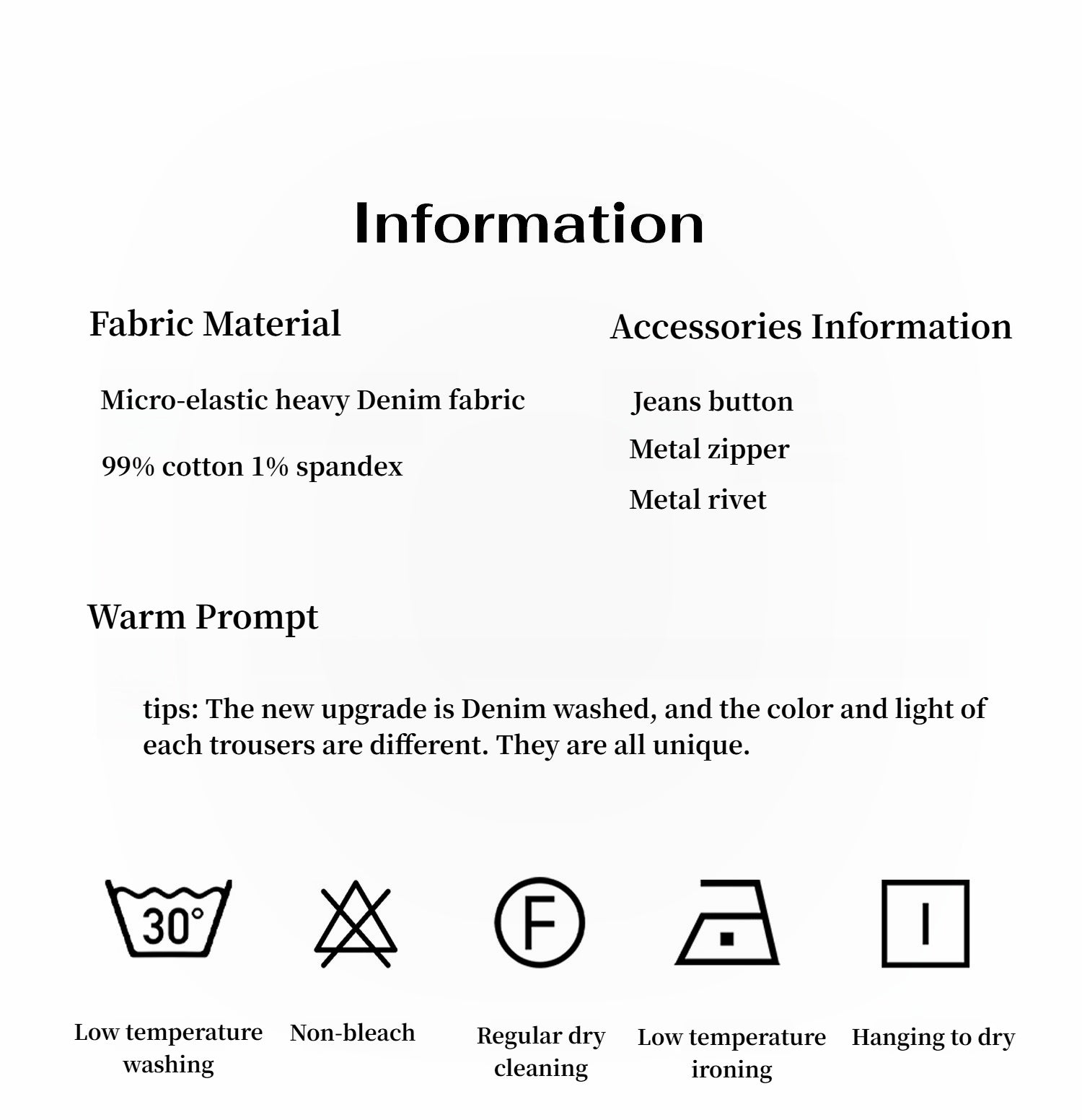 High-quality cotton coarse yarn count right twill fabric, with clear and delicate texture. Appropriate amount of spandex elastic fiber ratio slightly elastic texture comfortable to wear, while retaining stiffness, not easy to wrinkle or bulge. Heavy-duty refreshing washed blue tone, in line with the spring and summer atmosphere. Paired with hand-rubbed cat whiskers, it is more fashionable and individual.