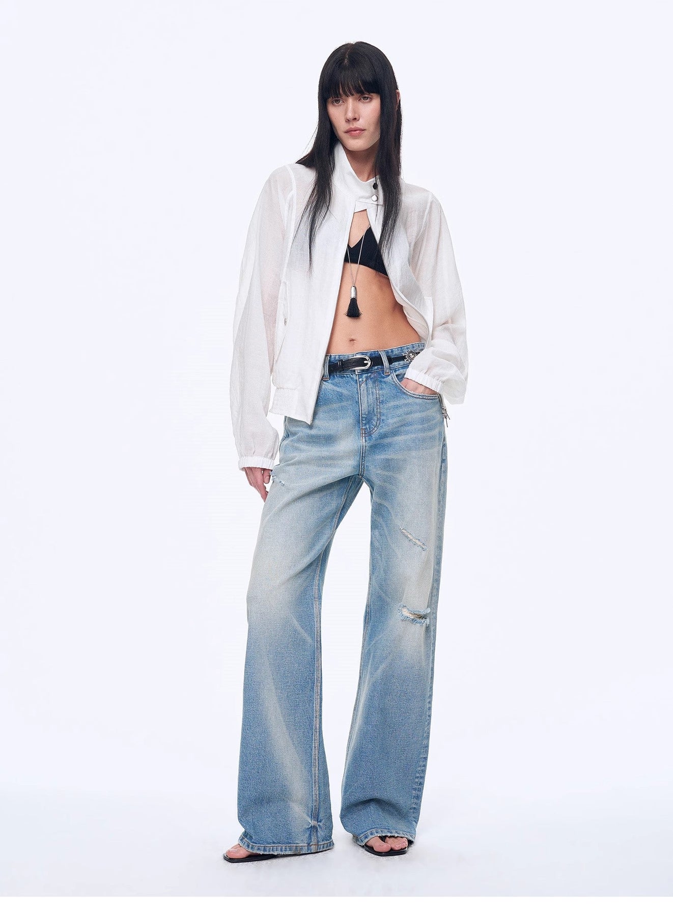 The whole piece has hand-wiped whiskers in many places with glue stitching, and the pants are embellished with individual holes. The back knees and distinctive lightning whiskers make the back piece twice as fashionable. Paired with a retro blue wash base color, it creates a new visual denim.