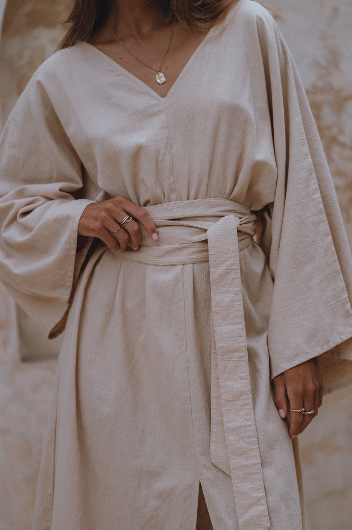 Our handcrafted Hana kimono style dress is a must-have for any woman's wardrobe. Designed from 100% breathable crinkle linen, it is finished with elegant v-neckline, relaxed sleeves and beautiful wrap around kimono style belt. You can dress it up or dress it down, making it a piece that adapts to every occasion.