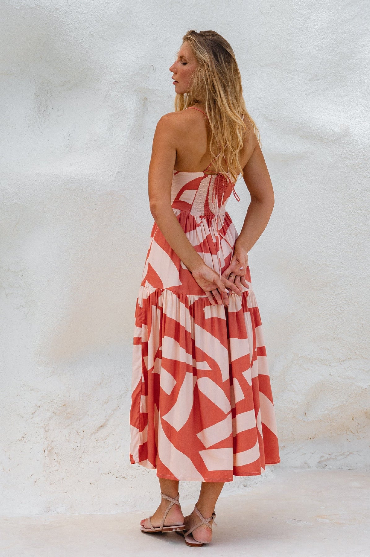 Experience the ultimate beachside holiday vibes with our Sea Dreamer midi dress. Handcrafted from soft and airy rayon it is framed with smocked back, criss cross ties and dreamy voluminous two-tier skirt.